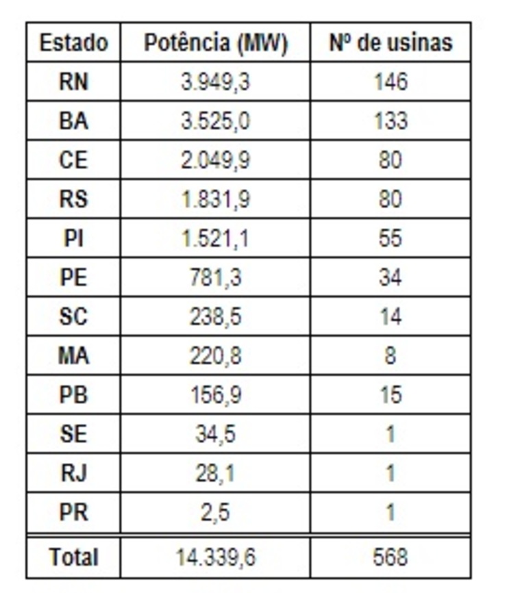 [FOTO1]O Brasil ultrapassou a marca de 14 GW de capacidade instalada de energia eólica, divididas em 568 parques eólicos e mais de 7 mil aerogeradores em 12 estados do País. O Ceará é o terceiro estado com a maior capacidade instalada. Com 80 usinas, a potência do Estado é de 2.049,9 MW. À frente do Ceará estão Rio Grande do Norte, que tem 146 usinas e produziu 3.949,3 MW, e Bahia, que tem 133 usinas e produziu 3.525,0 MW.