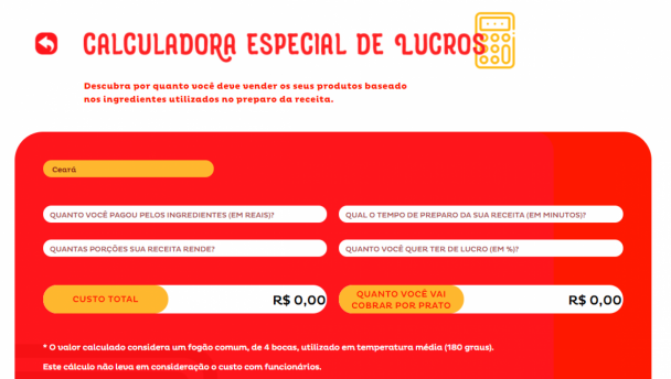A ferramenta calcula o valor final de cada prato, a partir do investimento, lucro desejado, quantidade de porções e tempo de preparo no fogão
