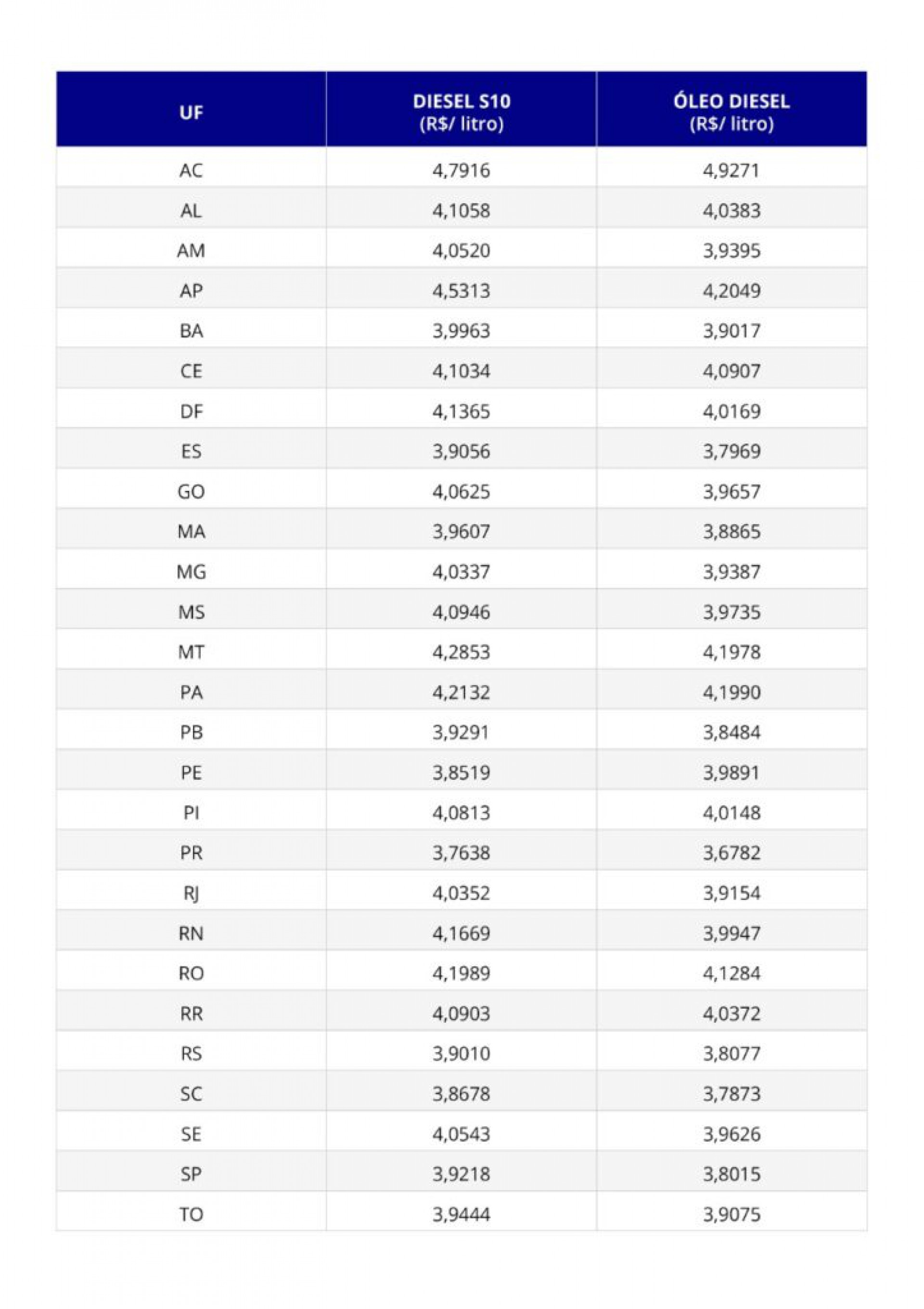 Veja como ficará o preço-base para cálculo do ICMS sobre o diesel em cada estado: