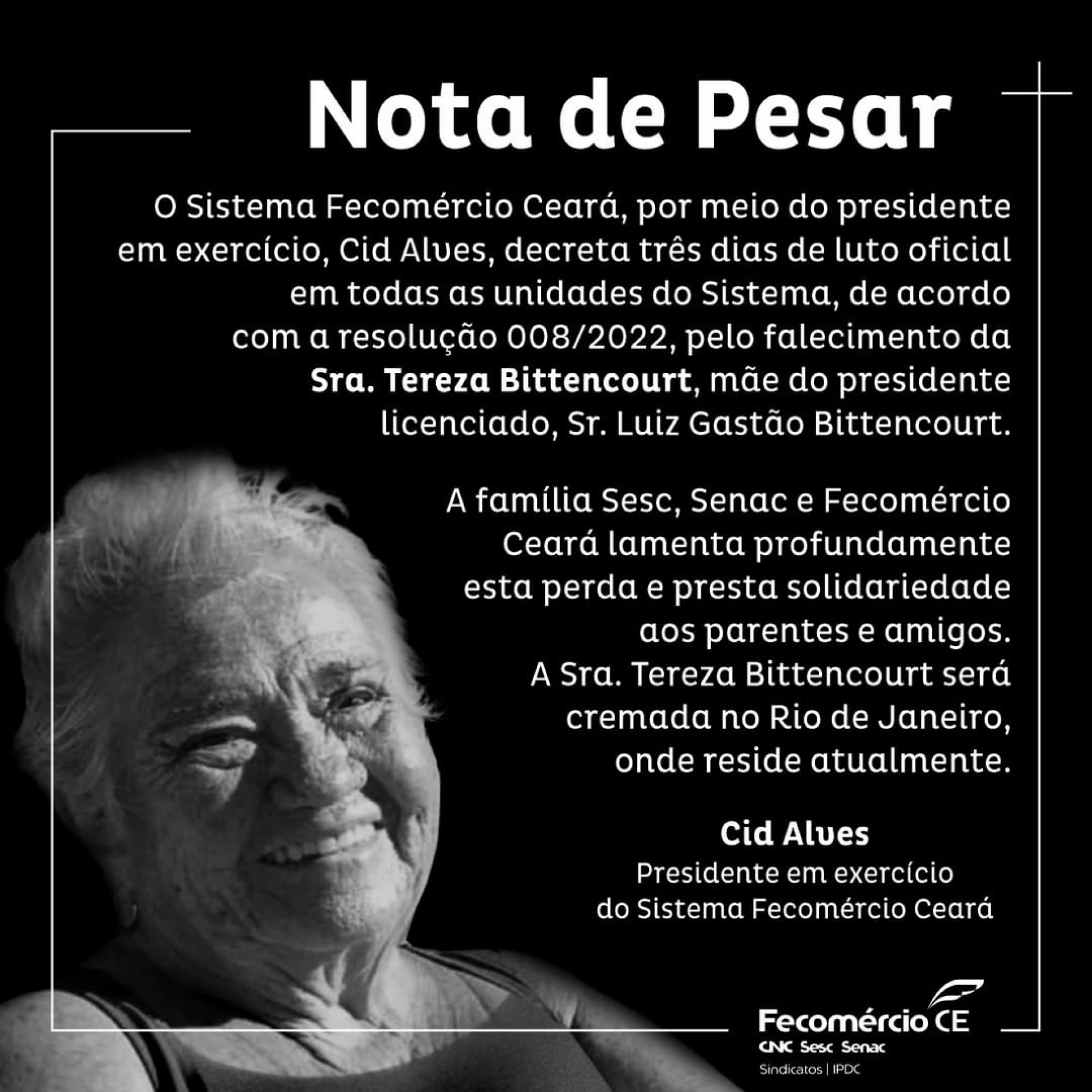 A Federação do Comércio de Bens Serviços e Turismo do Ceará (Fecomércio/CE) decreta estado de luto oficial por três dias em respeito a família de Tereza Bittencourt cuja morte foi informada na manhã desta segunda-feira, 15 de agosto.