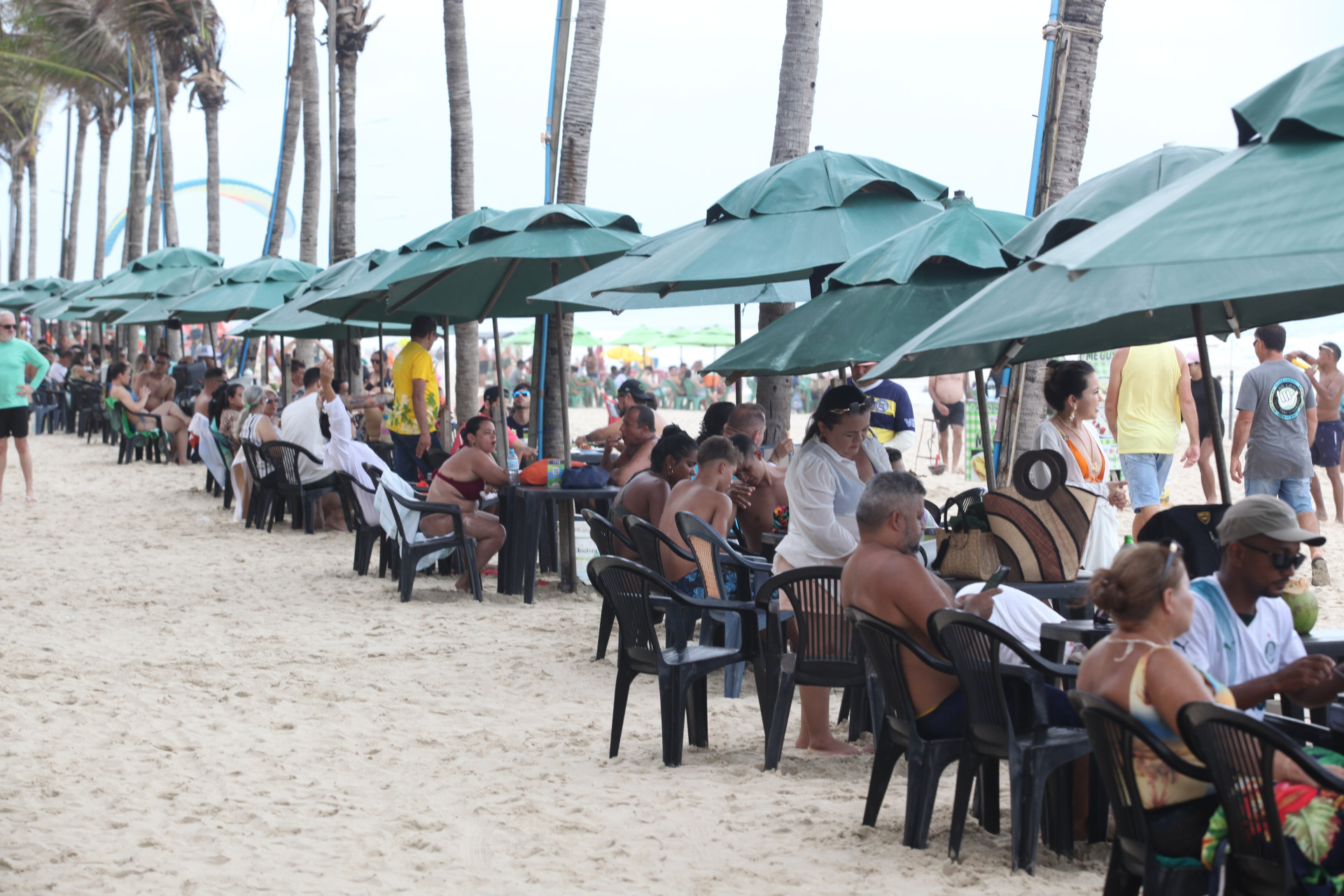 Na Praia do Futuro, barracas lotadas e grande movimentação de pessoas na faixa de areia e no mar.