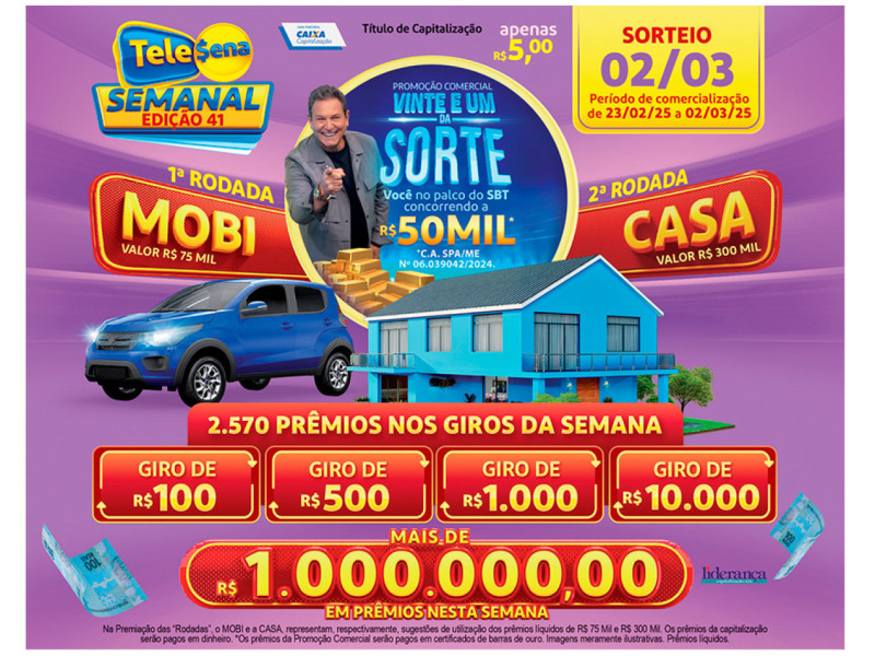 O resultado do 41º sorteio da Tele Sena Semanal foi divulgado às 11h deste domingo, 02 de março de 2025 (02/03/25), pelo SBT. Mais de R$ 1 milhão em prêmios.
