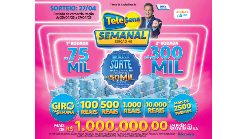 O resultado do 49º sorteio da Tele Sena Semanal é divulgado às 11 horas (horário de Brasília) de hoje, domingo, 27 de abril de 2025 (27/04/25), pelo SBT.