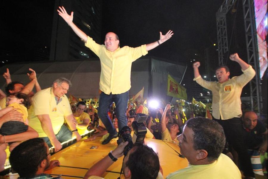 O ex-ministro Ciro Gomes (PDT) também se fez presente na festa da vitória, envolto em uma bandeira de seu partido. O governador Camilo Santana (PT) e a vice-governadora Isolda Cela (PDT) também estiveram sob o palanque.