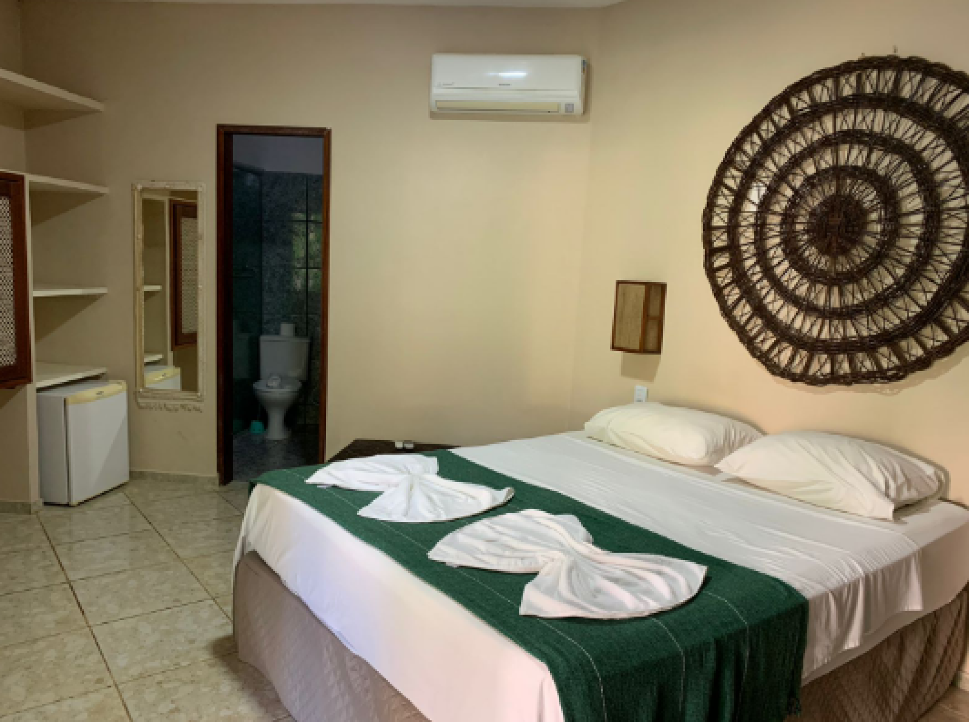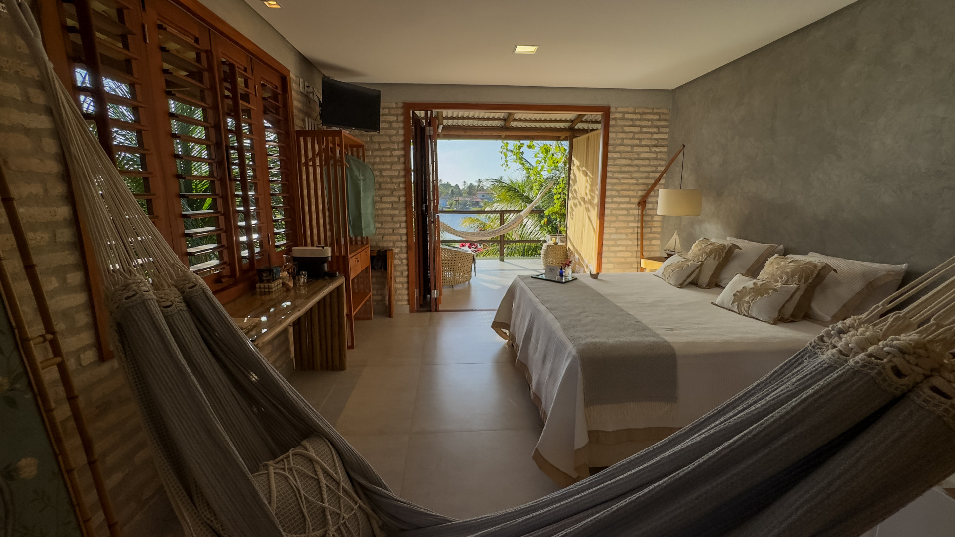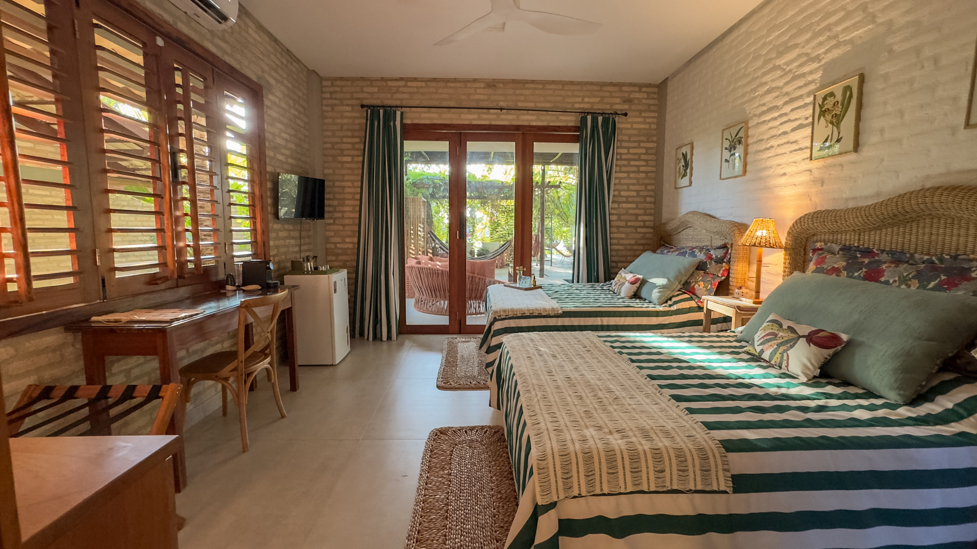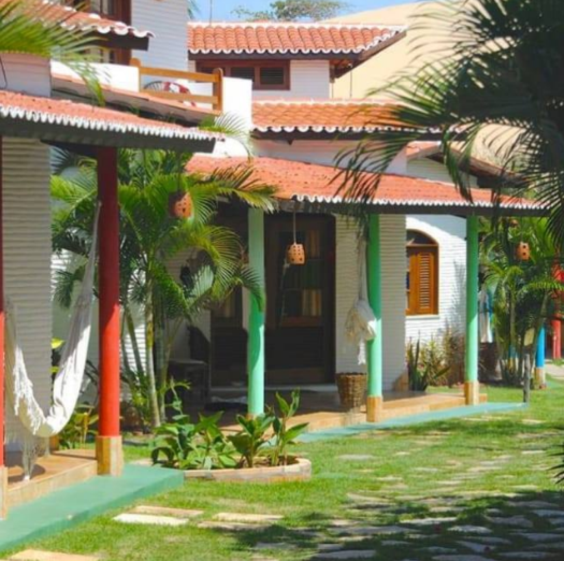 Estão disponíveis desde quartos mais simples, com ventilador e frigobar, até suítes completas, com ar-condicionado, TV, varanda com rede e vista para o jardim. A maioria tem camas de casal e de solteiro, podendo receber famílias e grupos de amigos com conforto.