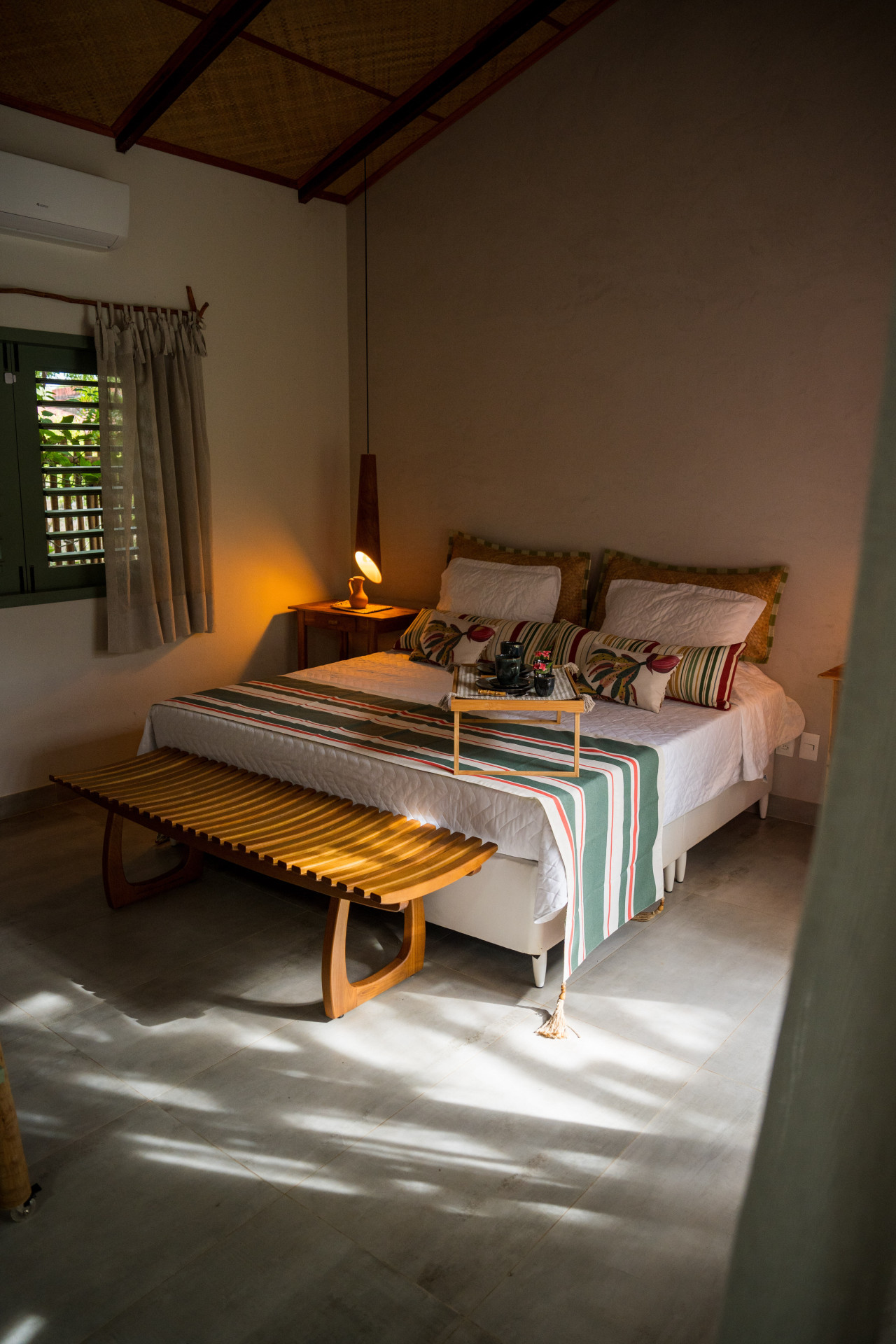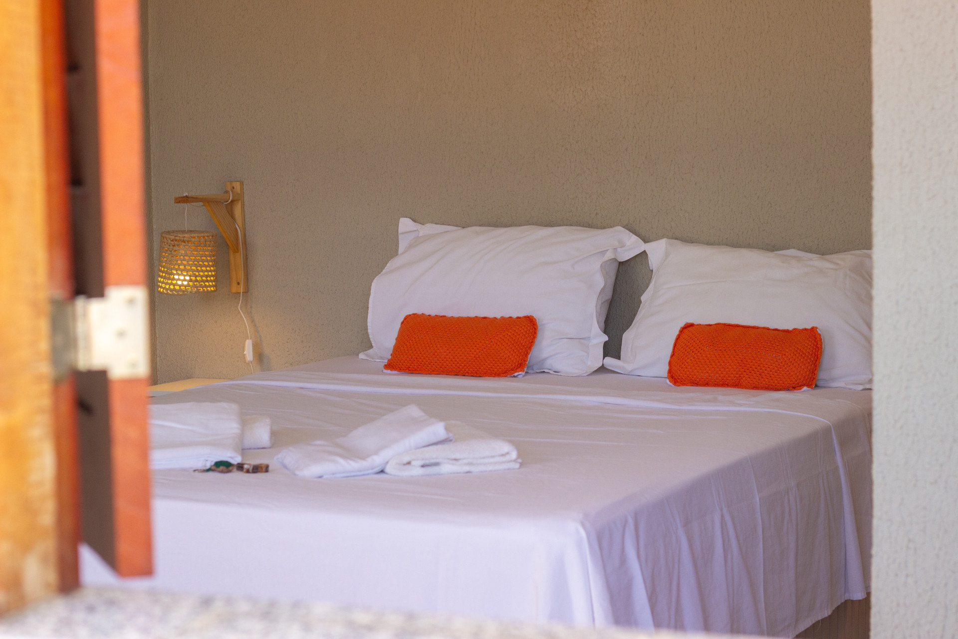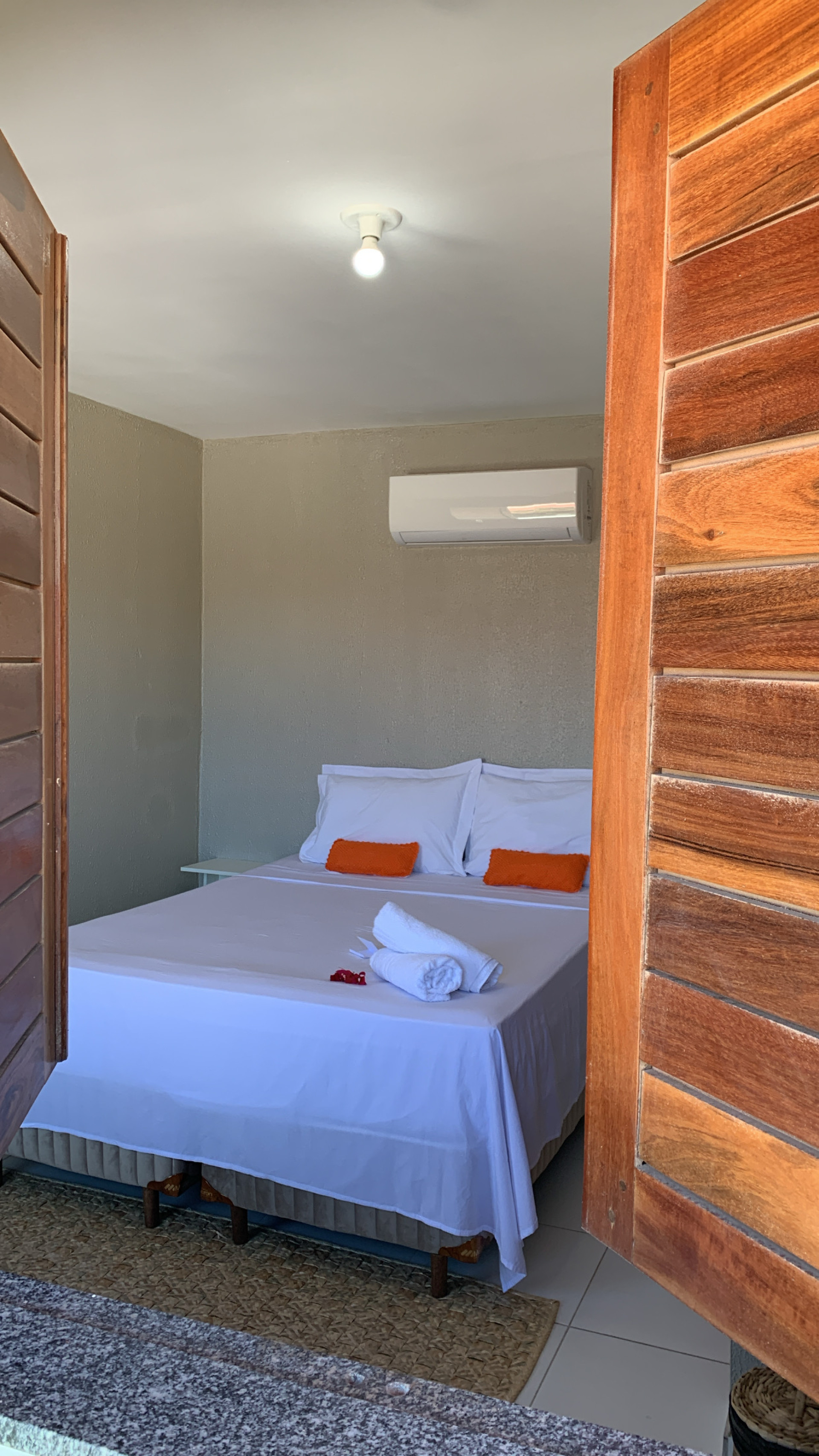 Estão disponíveis desde quartos mais simples, com ventilador e frigobar, até suítes completas, com ar-condicionado, TV, varanda com rede e vista para o jardim. A maioria tem camas de casal e de solteiro, podendo receber famílias e grupos de amigos com conforto.