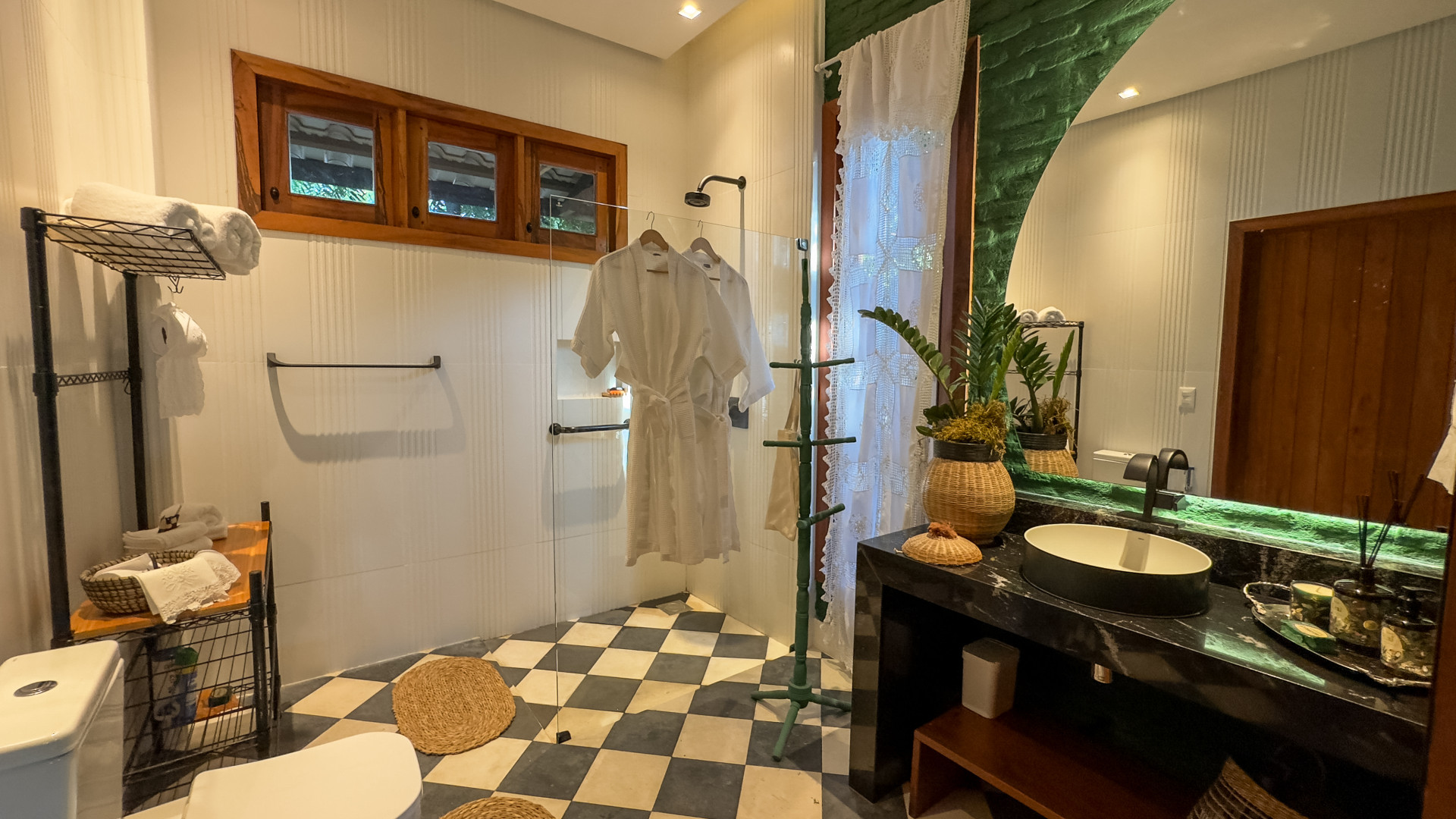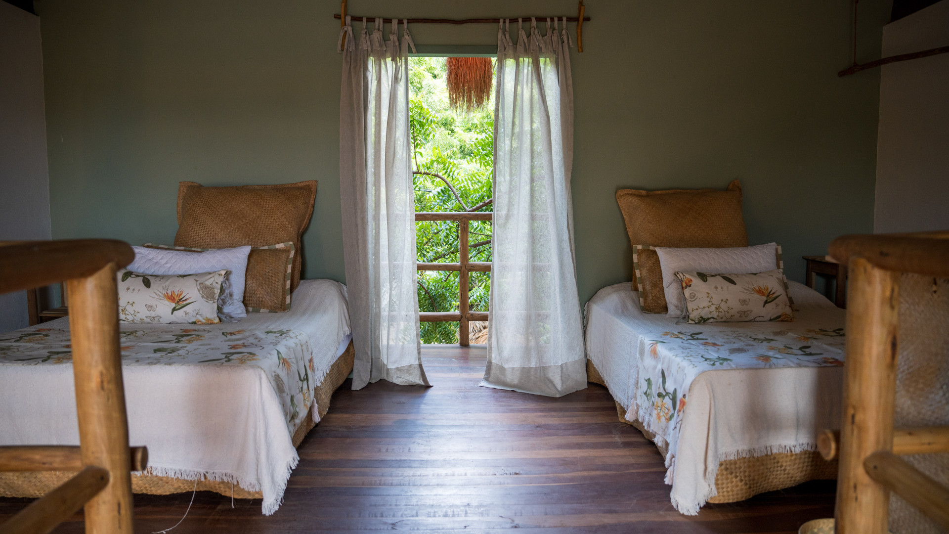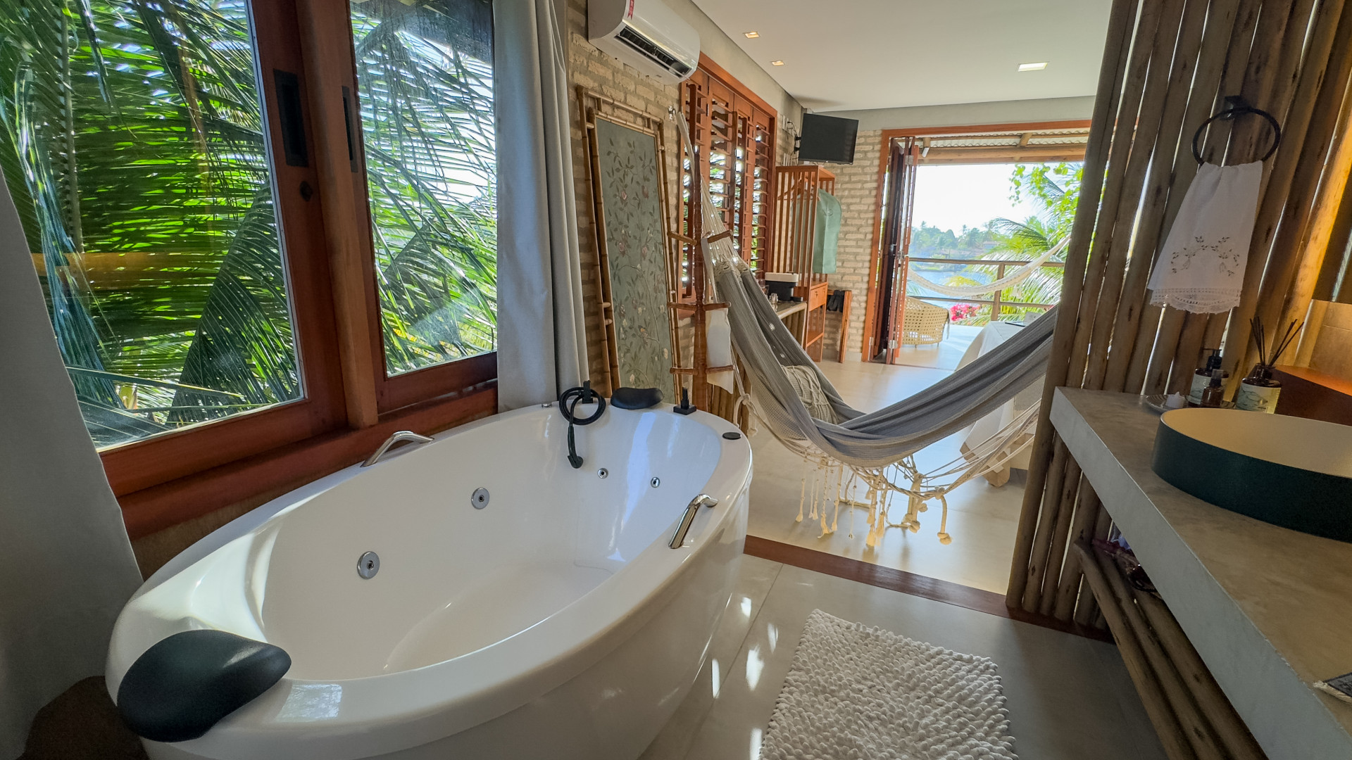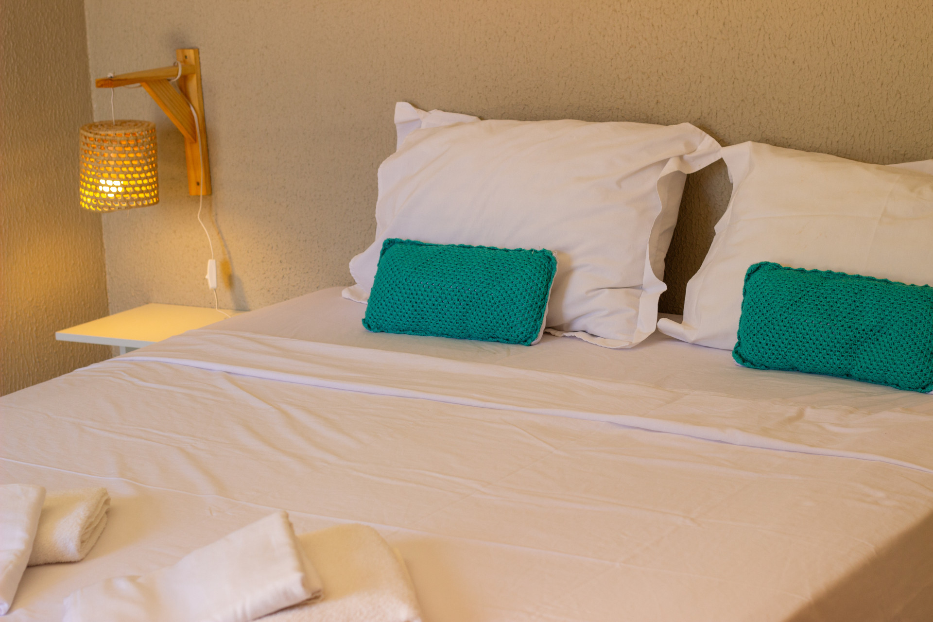 Estão disponíveis desde quartos mais simples, com ventilador e frigobar, até suítes completas, com ar-condicionado, TV, varanda com rede e vista para o jardim. A maioria tem camas de casal e de solteiro, podendo receber famílias e grupos de amigos com conforto.