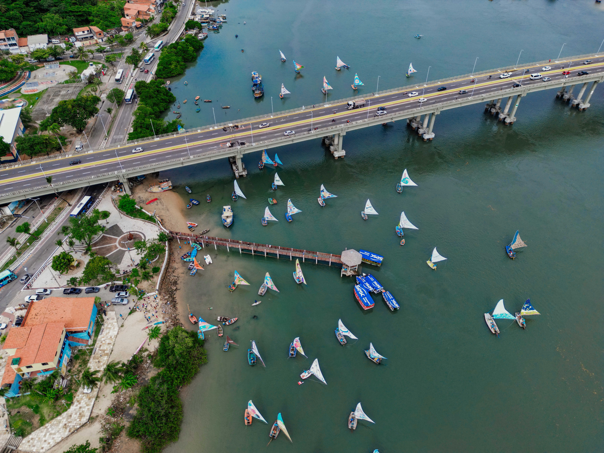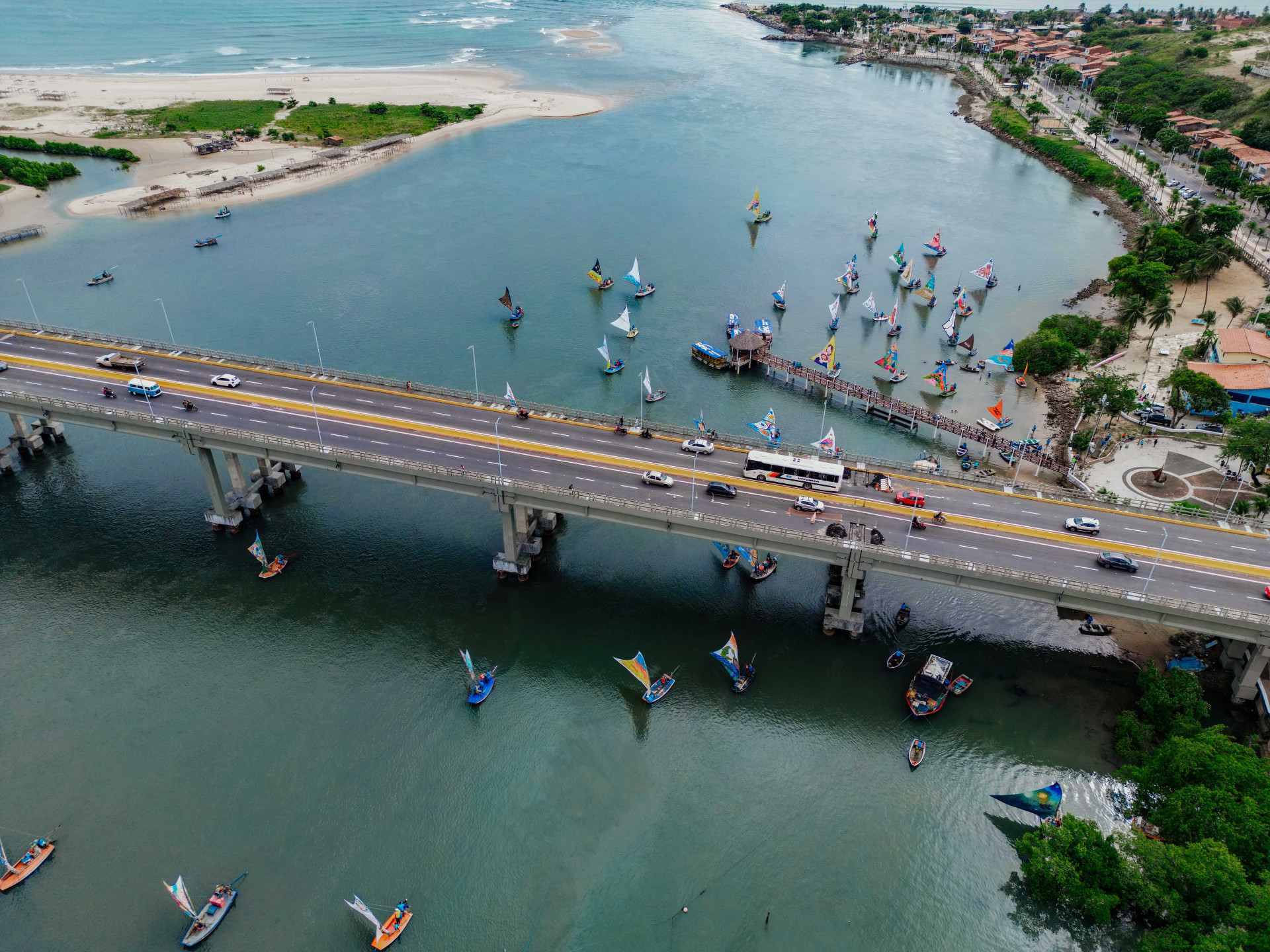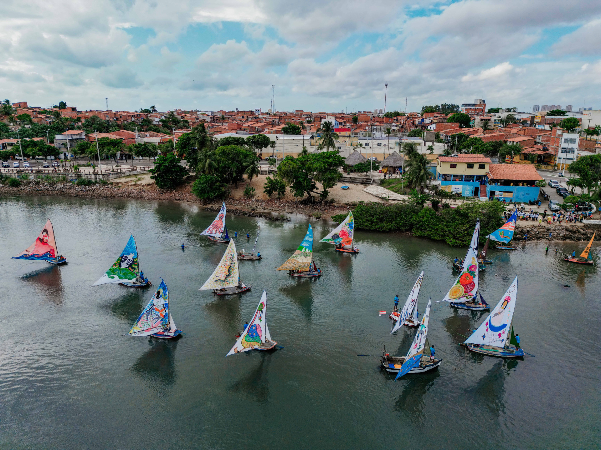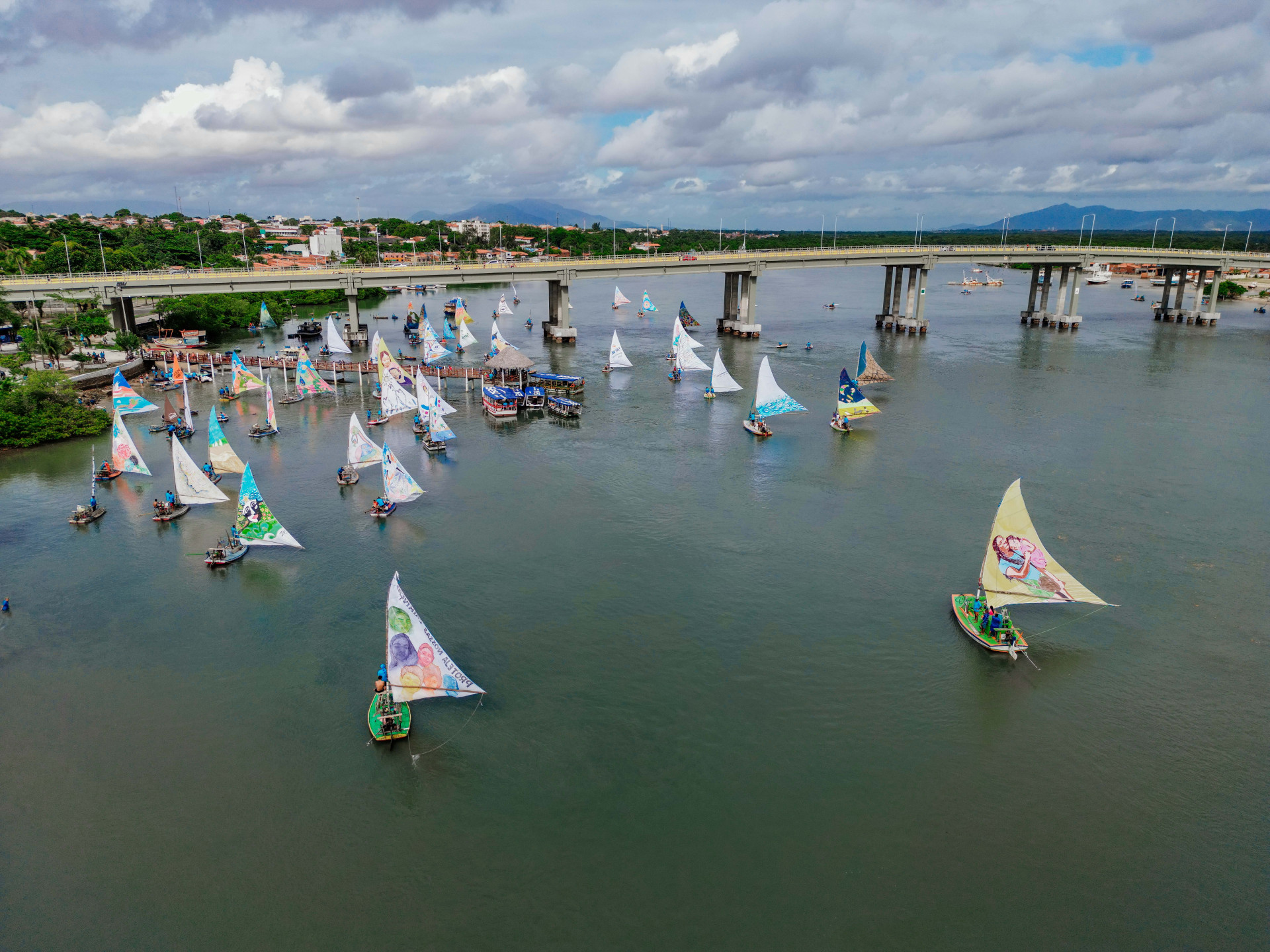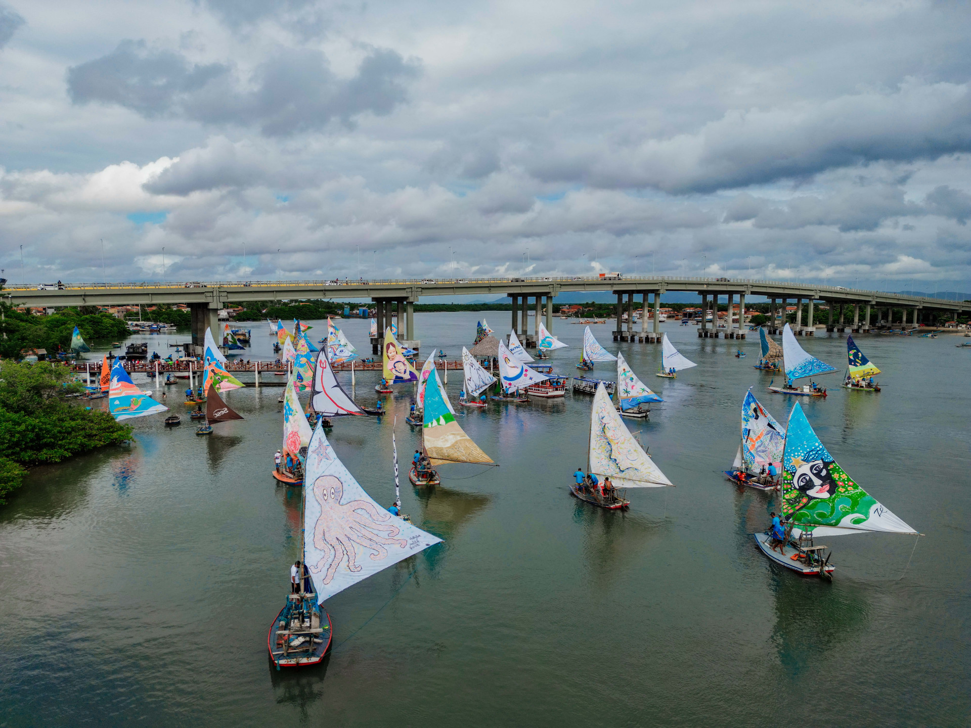 Enquanto as jangadas esperavam para partir, as telas gigantes compostas por velas de até oito metros atraíram a atenção de dezenas de pessoas. O público aproveitou para tirar fotos, fazer vídeos e se encantar com o espetáculo visual.
