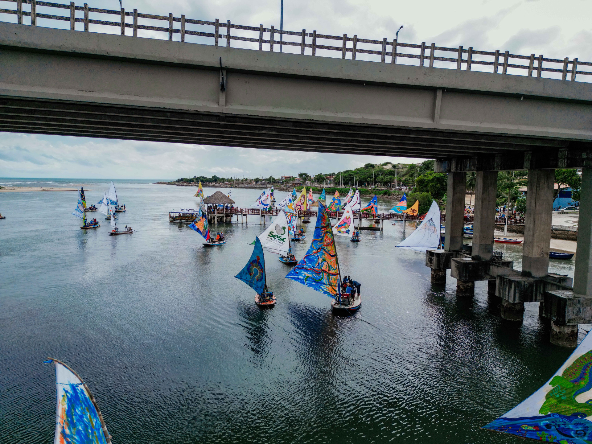 A Enseada do Mucuripe amanheceu mais colorida no último domingo, 23. O local recebeu a 5ª edição do Aquavelas, exposição flutuante de jangadas promovida pelo Sistema Fecomércio, por meio do Sesc Ceará. Este ano, o evento apresentou 65 embarcações com velas pintadas por artistas cearenses, sendo 14 inéditas e as demais de edições anteriores. As jangadas seguiram desfilando pelo mar até o Vila do Mar, na Barra do Ceará, enfeitando a orla de Fortaleza e encantando quem avistava as obras de arte flutuantes.