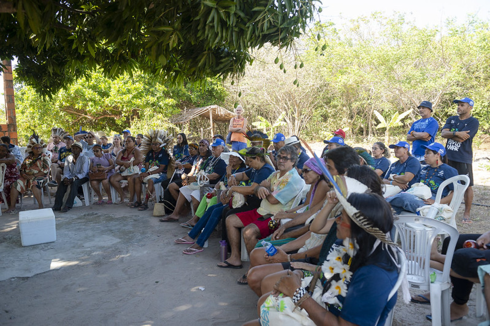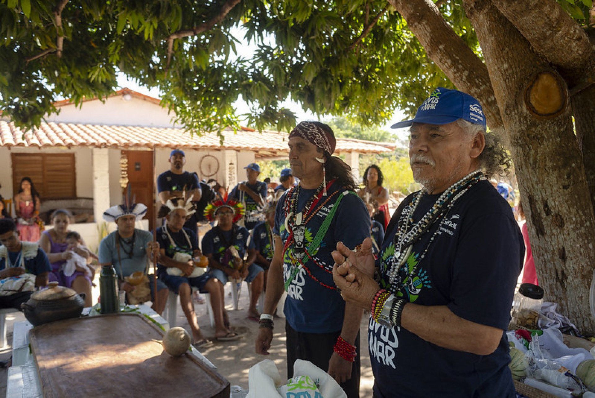 A tarde foi de celebração para os povos originários. O caminho de areia levou os convidados para uma grande festa não só dos Tremembés, mas de todos os indígenas. No Terreiro Tremembé na Comunidade Córrego do Urubu, Cacique João Venâncio e Amarildo Marques, ambos Tremembé, acolheram os mais de 40 representantes de 14 povos e movimentos indígenas do Estado. O anfitrião Amarildo declarou-se honrado por estar recebendo todos para conhecer seu terreiro. Cacique João Venâncio complementou a fala de Marques dizendo: “Desejo força às aldeias, crianças, anciãos. Nem os órgãos competentes aos povos originários fazem isso que o Sesc fez.”