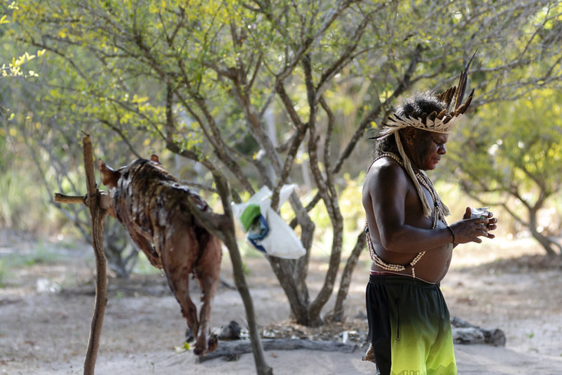 Entre falas, eles celebravam. Urravam gritos de guerra, entoavam canções tradicionais. Os bebês iam de colo em colo, as crianças corriam e as mais velhinhas, pegavam urucum do pé para retocar a pintura do rosto e do corpo. Às vezes, surgia um café quentinho da cozinha. Disseram, da porta para dentro, que as paredes foram erguidas pelo próprio Amarildo. A arte na parede da cozinha entrega o zelo pelo lar, assim, como as das vigas externas.
