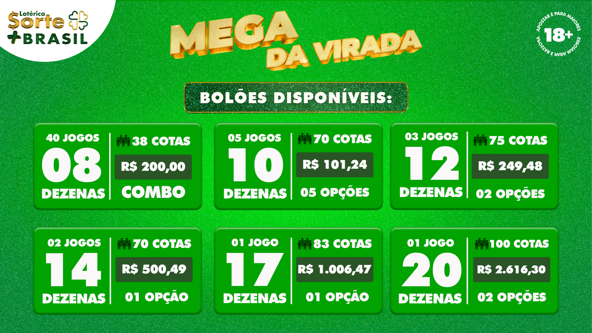 Os bolões da Sorte Mais Brasil são perfeitos para quem deseja aumentar suas chances de vitória com economia. A partir de R$ 101,24 você participa de grupos organizados e ainda conta com a credibilidade de uma rede que entende do assunto, possui mais de 15 anos no mercado e tem 22 unidades fisicas.