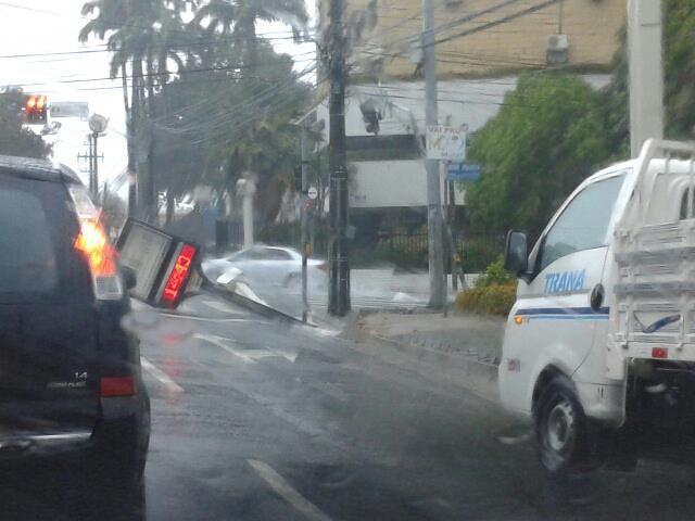 Um buraco abriu, no Cruzamento da avenida Desembargador Moreira com avenida Pontes Vieira, e fez com que um equipamento de fiscalização eletrônica e um letreiro eletrônico de publicidade afundassem, na tarde desta sexta-feira, 22.