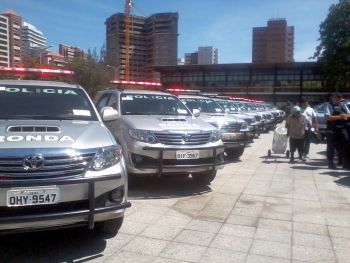 Mais de 200 veículos foram entregues nesta sexta-feira, 5, à Polícia Militar do Ceará para reforçar o policiamento no interior do Estado. Segundo a Secretaria de Segurança Pública e Defesa Social (SSPDS), ao todo, foram entregues 101 viaturas (53 para a Polícia Civil, 40 ao Ronda do Quarteirão e oito à PM do interior) e 100 motocicletas. O evento ocorreu no Palácio da Abolição teve a participação do governador Cid Gomes.