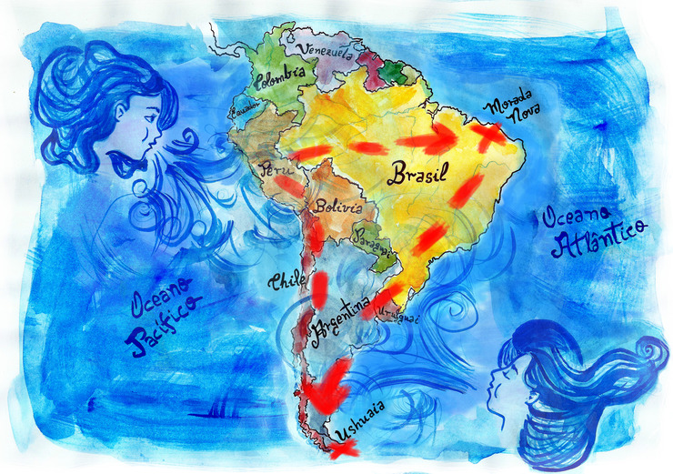 O diário, que deverá ser livro, e os retratos, que comporão uma exposição, poderão ser acessados no site e com uma cota de R$ 2 por mês é possível acompanhar sempre que ela postar. Além do Brasil, Argentina, Uruguai, Paraguai, Chile, Peru e Bolívia serão visitados. O ponto final, que marca o caminho de volta é Oshuaia, a capital da Província da Terra do Fogo, na Argentina. A localização, no extremo sul do continente, foi um dos motivos que determinaram a escolha da cidade. Assim como o começo calhou de ser justo no princípio da história, o fim é onde o chão latino termina.