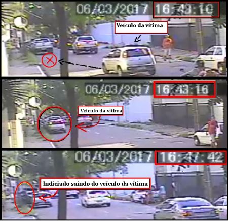 As câmeras de circuito de monitoramento de prédios e estabelecimentos comerciais identificaram que o advogado Victor Henrique da Silva Ferreira Gomes, de 23 anos, abandonou o automóvel do guarda municipal na rua General Silva Júnior.