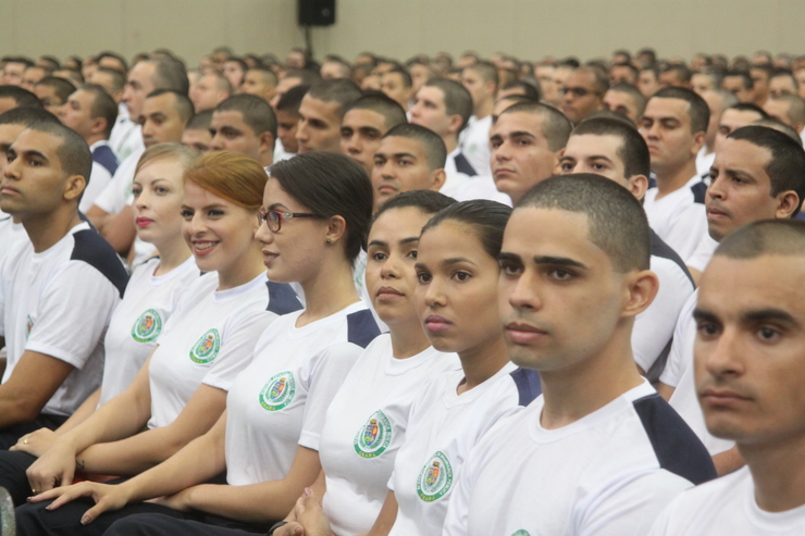 Sentados em fila no Salão Almofala do Centro de Eventos do Ceará, 1.400 aprovados no concurso da Polícia Militar assistiram à aula inaugural da 2ª turma do Curso de Formação Profissional para a Carreira de Praças da Polícia Militar, nesta manhã. Os presentes ouviram a palestra ministrada pelo titular da Secretaria da Segurança Pública e Defesa Social (SSPDS), André Costa, e as palavras de motivação do governador do Estado, Camilo Santana. A expectativa é que, em cinco meses, os novos policiais já atuem nas ruas do Ceará. Ao todo, foram aprovados no concurso 4.200 pessoas.