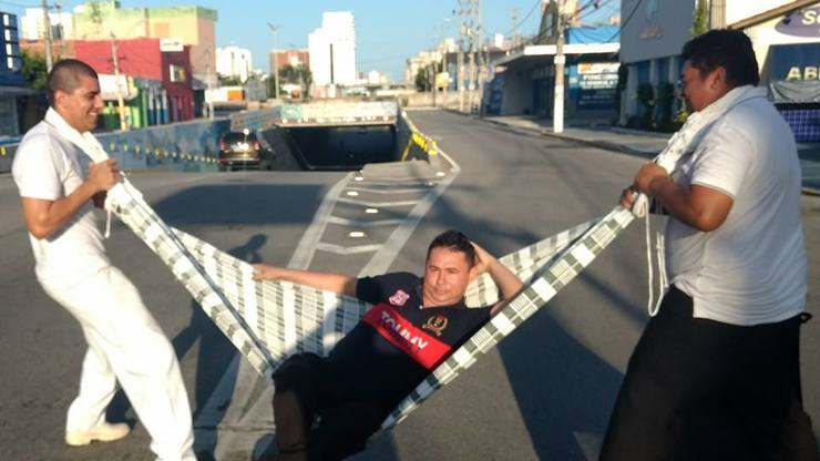 [FOTO1] Um sujeito deitado numa rede armada por outros dois, em plena avenida Santos Dumont, na Aldeota. A imagem publicada no Facebook retrata mais uma “marmota” protagonizada pelo cearense Beto Ferrer, 32, desta vez, fazendo graça com o baixo fluxo de veículos numa das avenidas mais movimentadas da Capital numa manhã de domingo. O humorista é o responsável pelo comercial da lanchonete Bib’s Burguer, localizada no bairro Bom Jardim, que viralizou na última semana nas redes sociais.