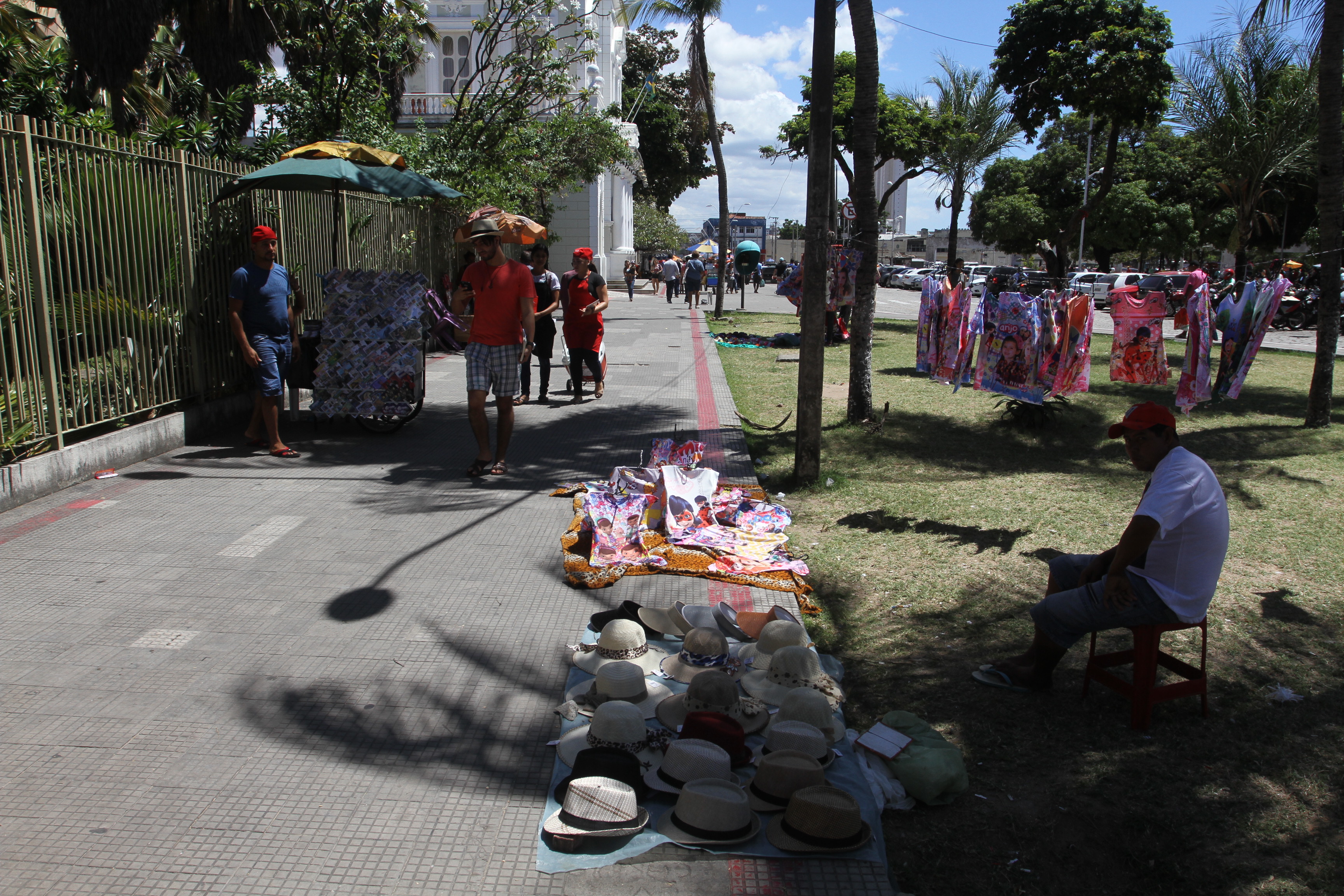 Para chegar ao Theatro José de Alencar (TJA), no último sábado, 29, a professora Joana d’Arc de Almeida, 36, precisou fazer malabarismo. A calçada do equipamento público fica, nesse dia da semana, completamente tomada por vendedores ambulantes: confecção, capas para celular, flores artificiais, chinelas japonesas são vendidos ao ar livre. “Tive que pedir passagem para chegar até a entrada (do Theatro), tropeçando nas mercadorias. Não tem canto nem pra gente andar”, reclama.