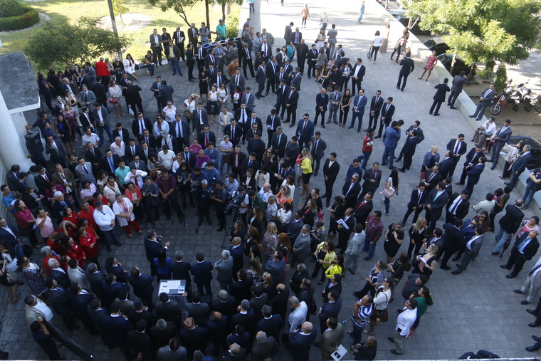 Advogados do Ceará e de diversos estados brasileiros estiveram em sessão de desagravo público no Fórum Clóvis Beviláqua contra o juiz da 2ª Vara de Família da Comarca de Fortaleza, Joaquim Solón Mota Junior. A medida é tomada quando um profissional é ofendido no exercício das funções ou em virtude delas. O magistrado é acusado pela Ordem dos Advogados do Brasil Secção Ceará (OAB-CE) de violar as prerrogativas profissionais da advogada Sabrina Veras durante audiência há exatamente um mês.
