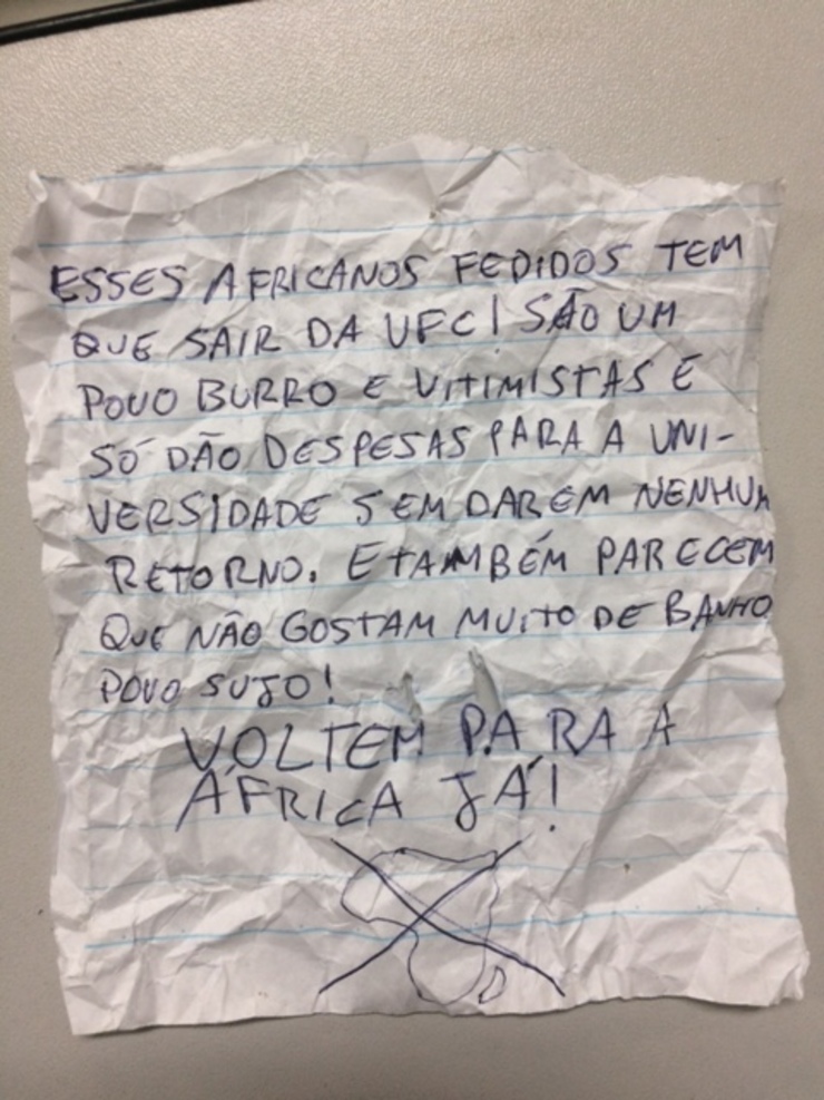 Com mensagens de cunho racista e xenófobo, o texto falava de estudantes imigrantes na universidade e dizia que eles deveriam ir embora. "Esses africanos fedidos devem sair dessa universidade. Essa gente só dá despesa para a UFC e não acrecenta em nada". O bilhete ainda chamava o povo negro de "burro e vitmista", além de incitar ódio contra venezuelanos, colombianos e "todo lixo que contamina a UFC".