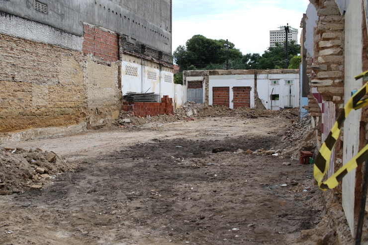 O POVO Online visitou o terreno localizado na esquina das ruas 25 de Março e Franklin Távora, nesta quinta-feira, 3, e verificou a demolição. Restam apenas duas grandes paredes, uma delas quebradas para a entrada de um trator que fez a retirada do entulho. Faixas e vigas foram colocadas para impedir a entrada de populares.