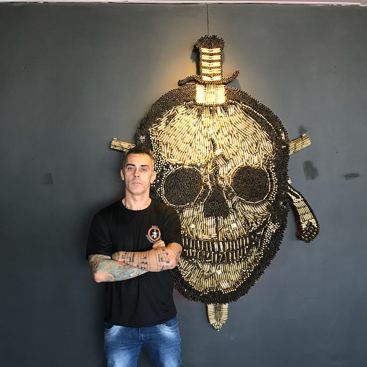 "Sou amigo próximo de um subcomandante do Bope. Eu estava em uma viatura quando olhei pro chão e viu uma cápsula de fuzil, aí me levantei pela escotilha (teto solar) e avistei o símbolo do Bope de longe. Foi aí que tive a ideia de produzir símbolo da caveira de cápsulas de bala", comenta.