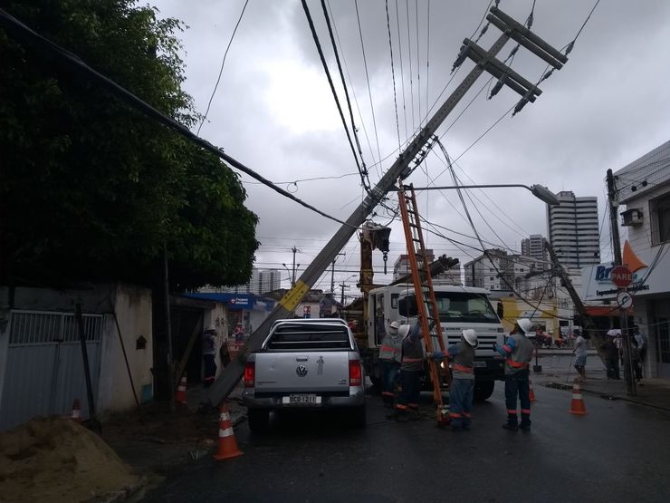 Três postes de energia foram quebrados e ficaram pendurados quando um caminhão passou arrastando os fios na manhã desta terça-feira, 10, por volta das 9 horas. Dois postes na avenida Aguanambi e um poste próximo à esquina, na rua Coronel Solón, ficaram danificados na base e tiveram fios arrancados. No entordo do local, trabalhadores afirmaram que dois quarteirões ficaram sem energia.