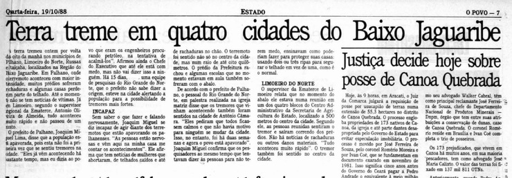 No dia 18 de outubro de 1988, no interior do Ceará, um terremoto assustou moradores e abalou estruturas de casas. No O POVO, a matéria informava que Fortaleza, Eusébio e quatro cidades do Baixo Jaguaribe foram afetadas pelo fenômeno. Nos municípios de Palhano, Limoeiro do Norte, Russas e Itaiçaba, moradores tiveram prejuízo financeiro e emocional, afinal, muitos ficaram assustados com o acontecido. O prefeito de Palhano, local que foi mais afetado, admitiu em entrevista concedida à época estar com medo e sem saber o que fazer.