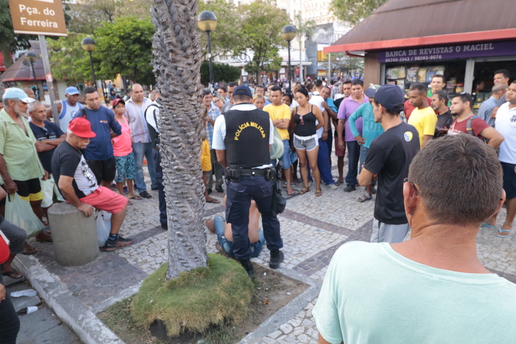 Um homem, sem identificação, sofreu uma abordagem violenta por parte de policiais militares (PMs) na Praça do Ferreira, no Centro de Fortaleza, nessa terça-feira, 23. De acordo com relatos dos agentes envolvidos no caso, o homem teria reagido à ação dos policiais que o detiveram após uma briga.