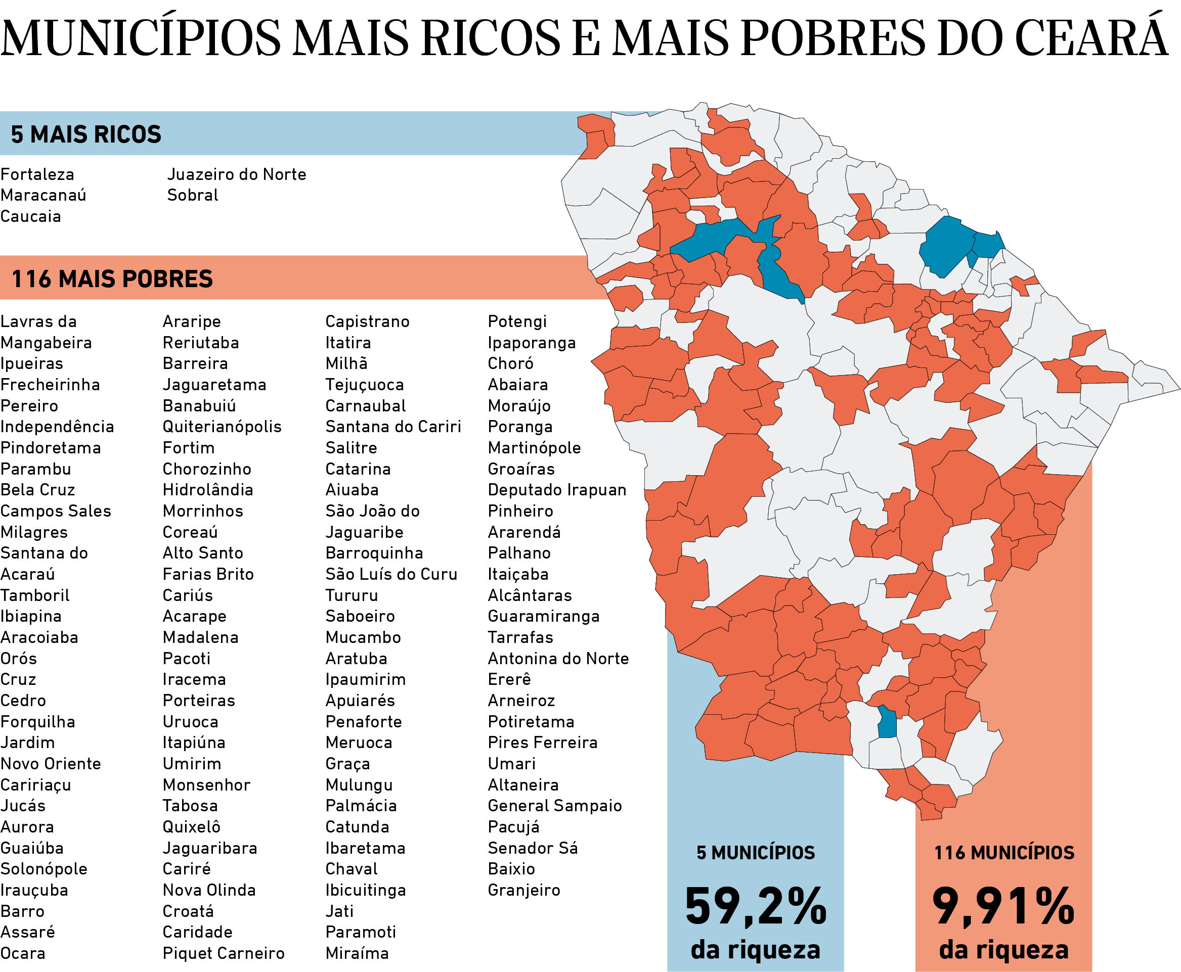 Do outro lado da tabela, os 116 municípios mais pobres do Estado não somavam, no mesmo período, nem 10% do total do índice do Estado. Mesmo com pouca participação na economia, as mesmas cidades possuem quase 22% da população cearense.