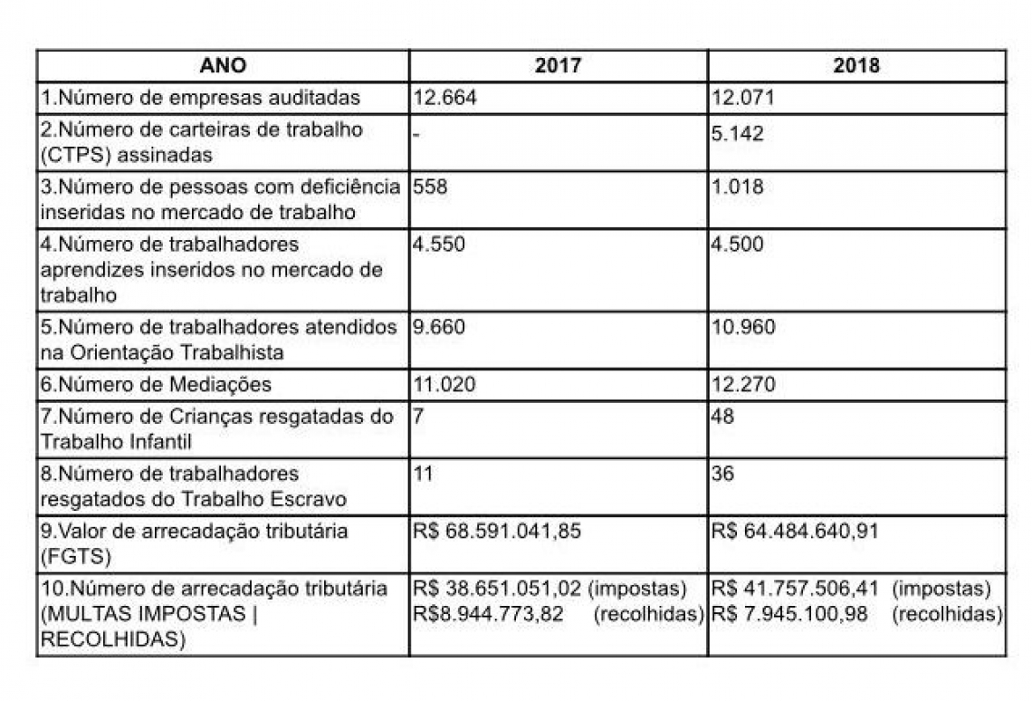 Em 2018, 12.071 foram empresas auditadas. Dessas, mais de 3 mil só da área de segurança do trabalho. Foram assinadas 5.142 carteiras de trabalho, incluindo 1.018 pessoas com deficiência inseridas no mercado de trabalho - o dobro em relação ao ano anterior. Foram realizadas mais de 12 mil mediações e mais de 10 mil orientações para trabalhadores que precisavam e atendimento para dúvidas e cálculos trabalhistas.