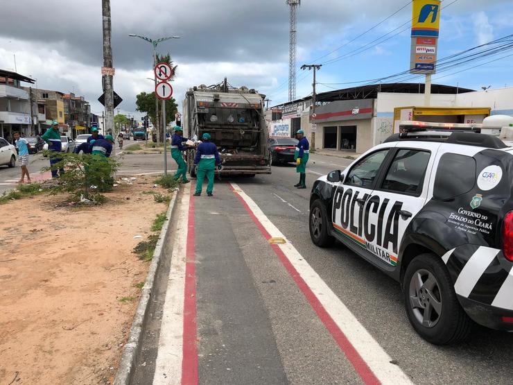 Polícia escolta caminhão durante coleta de lixo na avenida Leste Oeste; veja vídeo