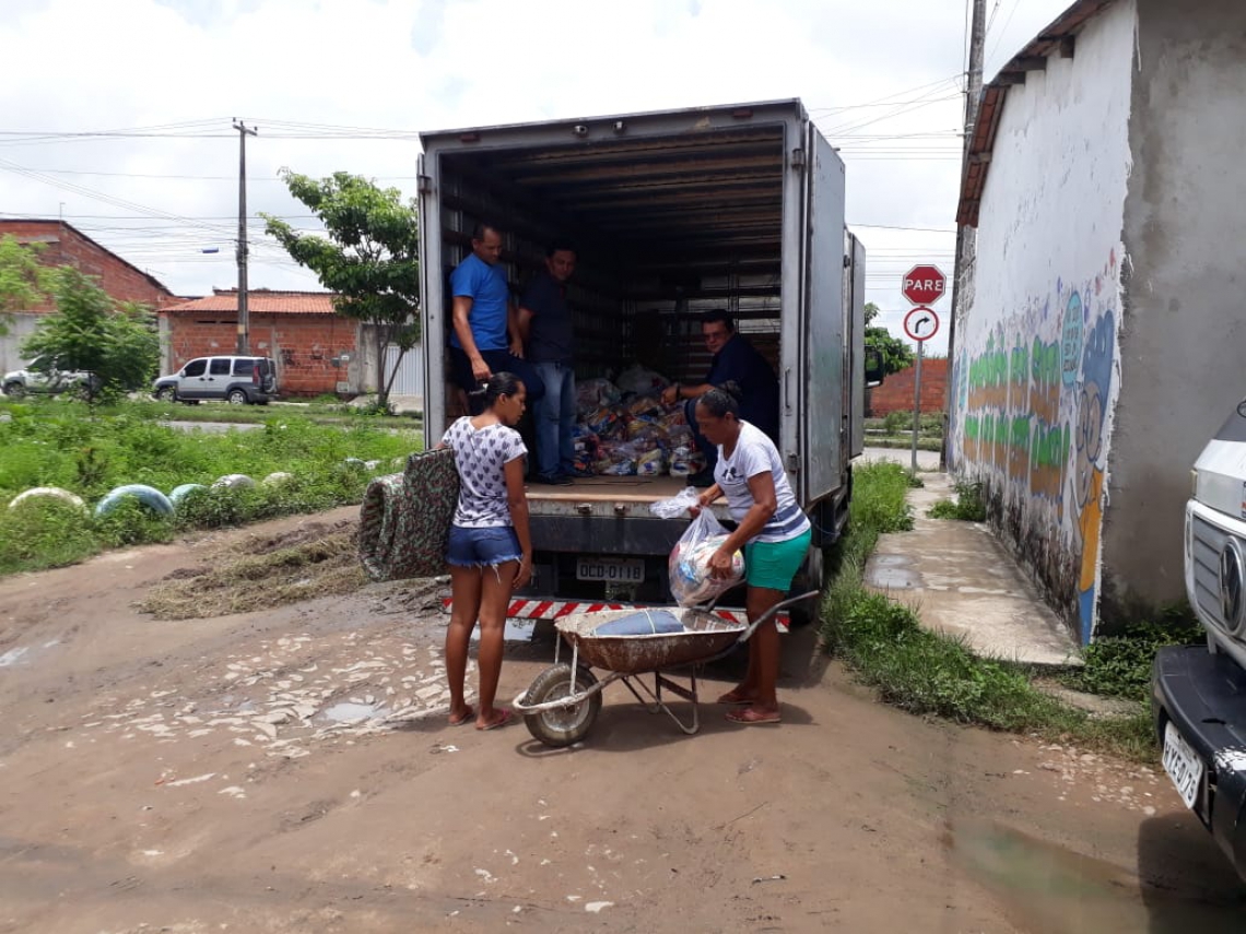 Funcionários também entregam cestas básicas para famílias atingidas por enchentes