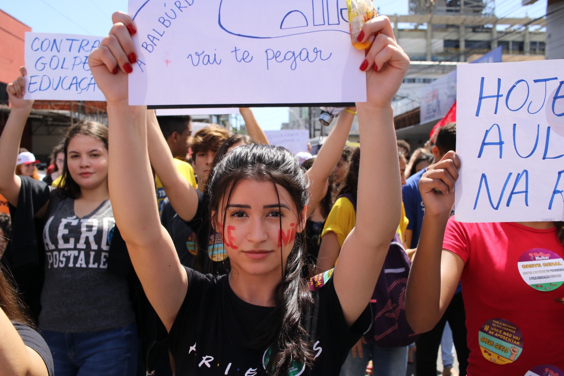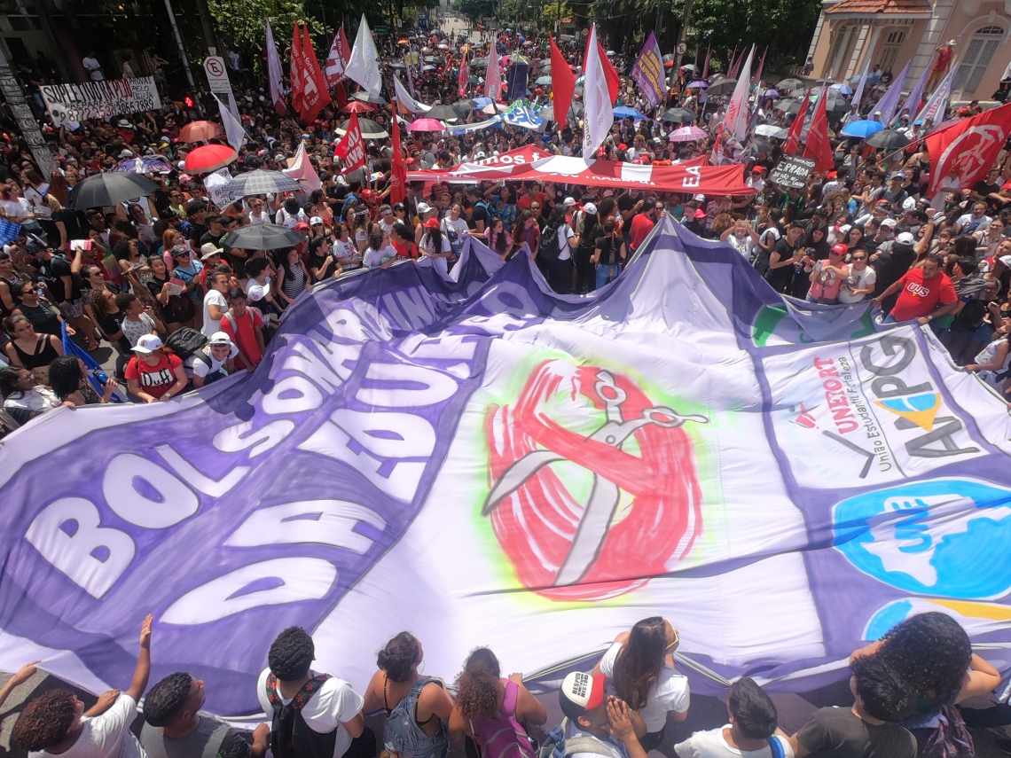 A estimativa dos organizadores é de que mais de 50 mil foram às ruas protestar nesta manhã na Cidade contra o bloqueio de cerca de 30% da verba discriminatória das universidades e institutos federais anunciado pelo presidente Jair Bolsonaro (PSL).