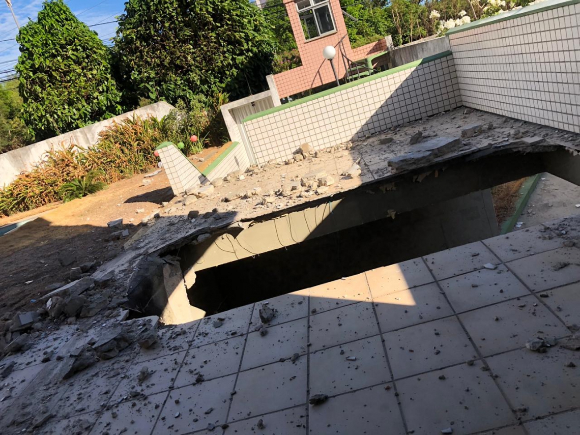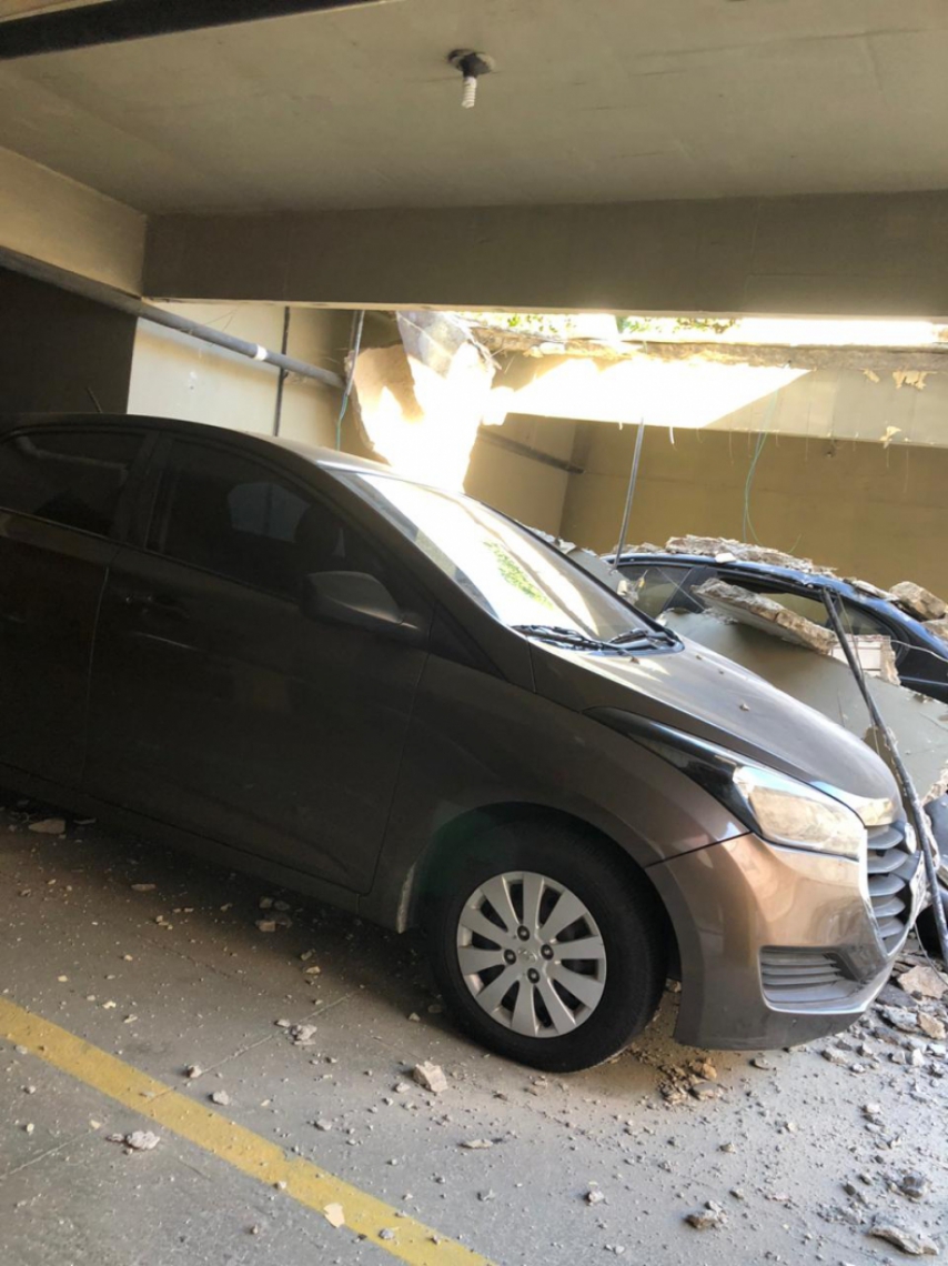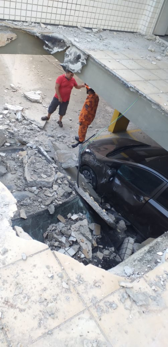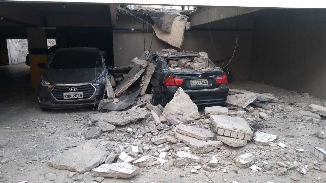 A estrutura que cedeu abriu um buraco no subsolo do prédio e atingiu dois carros que estavam estacionados. Além disso, o material de concreto também danificou as sacadas de andares inferiores. "Fomos a primeira equipe a chegar. Observamos que o revestimento de duas fachadas tinha caído e abriu um buraco no subsolo, vindo a danificar alguns carros. Nosso papel foi isolar o local e subir nos apartamentos para retirar as pessoas que ainda estavam dentro", afirmou a tenente dos Bombeiros, Isabel Cristina.