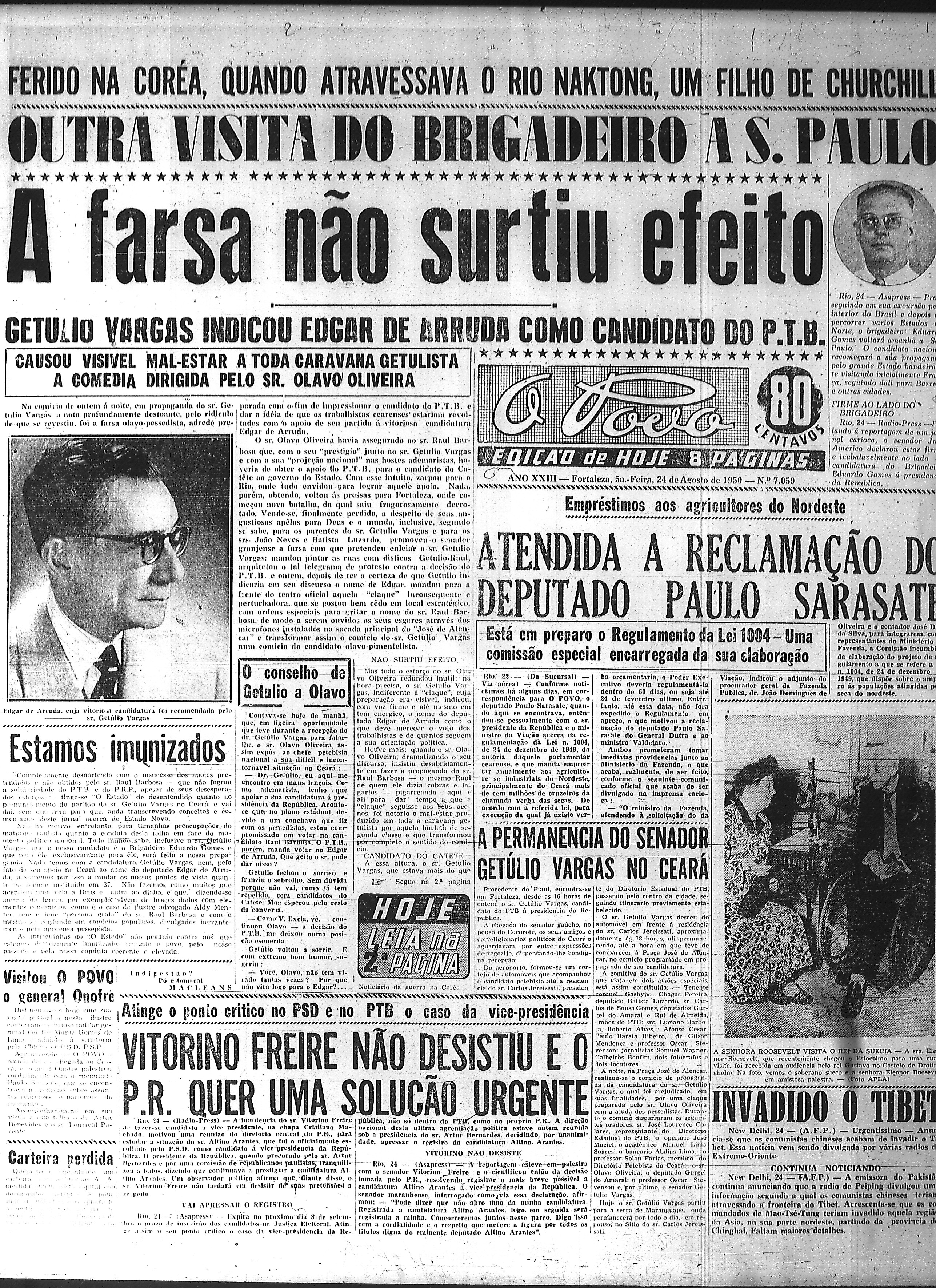 “Tenho a vaidade de ter trazido o (senador Carlos) Jereissati para o partido. Tenho a convicção de que ele é dos melhores elementos do PTB e, por isso, espero que o senhor dispense a ele o prestígio que faz jus pela dedicação, pelo esforço e pela lealdade que tem procedido”, diz a carta, datada de 1950 e disponível no Centro de Pesquisa e Documentação de História Contemporânea do Brasil da Fundação Getúlio Vargas (FGV/CPDOC).