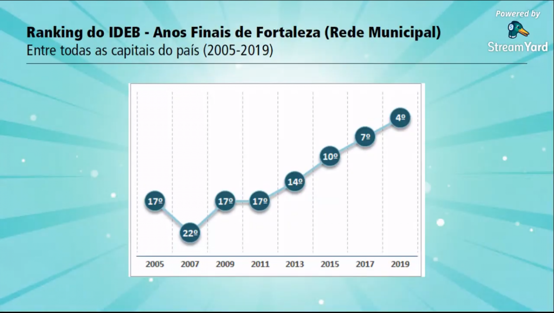 Fortaleza ocupa a quarta posição no ranking do Índice de Desenvolvimento da Educação Básica (Ideb) entre as capitais do País em relação ao Ensino Fundamental 2, que compreende o período entre o 6º e o 9º ano. A cidade cearense saltou 13 posições em relação a 2005, quando ocupava a 17ª colocação. O Ideb é um dos principais indicadores para medição da qualidade de ensino durante o ensino fundamental e teve os resultados de 2019 divulgados nessa terça-feira, 15.
