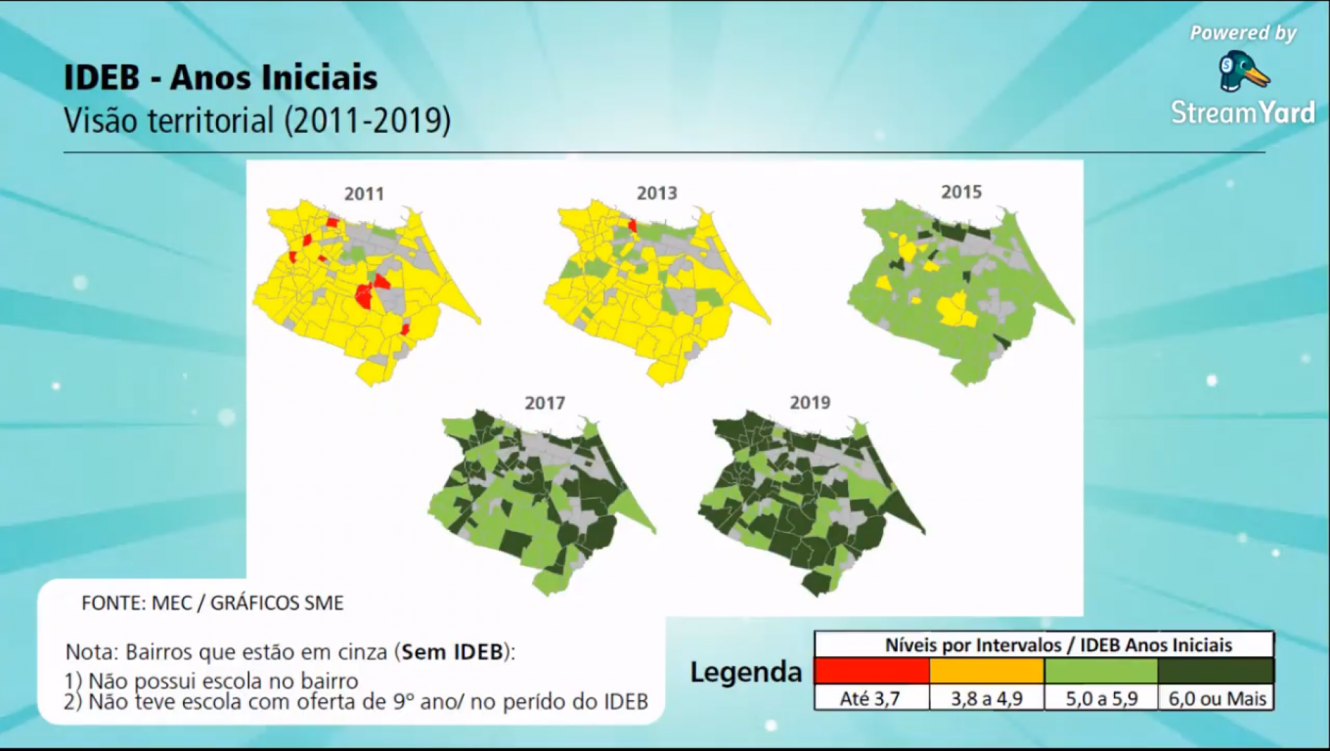 A cobertura territorial também foi aperfeiçoada na Capital. Nenhum dos bairros registrou Ideb menor que 4,5 em relação às escolas do ensino fundamental 1. Em 2011, somente três bairros registraram números superiores a esse. Em relação ao ensino fundamental 2, a situação também melhorou. Apenas um bairro ainda apresenta desempenho inferior a 4,5. Em 2011, essa era uma situação recorrente.