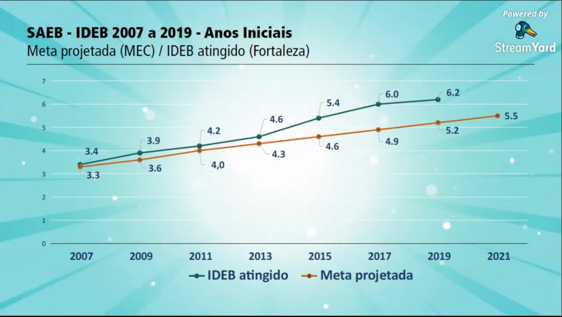 A Capital também se destaca nos anos iniciais, entre o 1º e 5º ano, e ocupa a 5º posição no mesmo ranking. Em relação a 2005, quando o indicador foi criado, Fortaleza saltou 15 posições. Em ambos períodos educacionais, a Cidade já havia conseguido bater a meta projetada pelo Ideb para 2021 ainda em 2017 e continuou crescendo.
