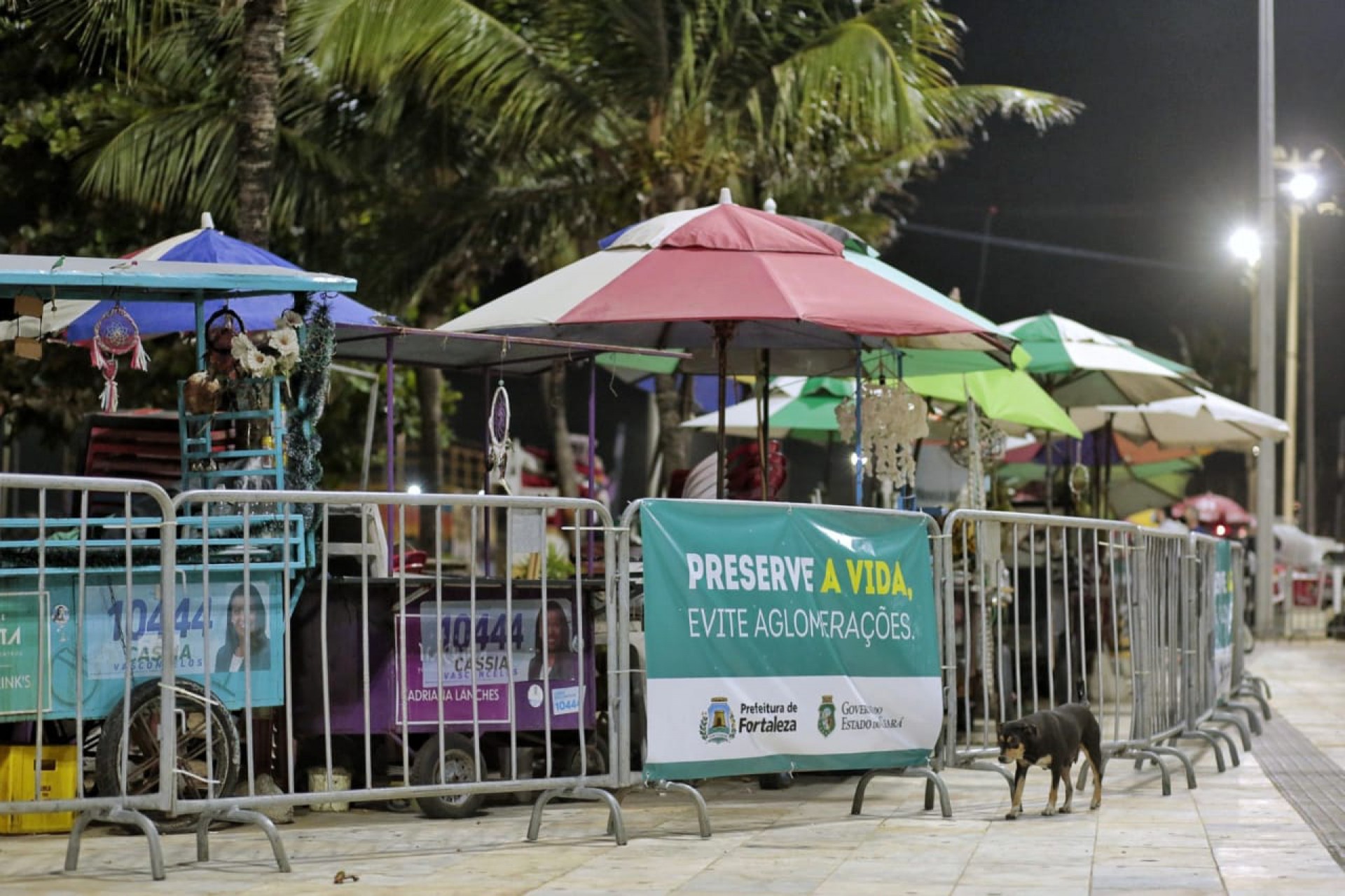 A orla da Praia de Iracema e da Beira Mar de Fortaleza têm forte presença de policiais e agentes da Autarquia Municipal de Trânsito e Cidadania (AMC). Até por volta de 21h40min ainda havia algumas vendinhas funcionando na orla da Beira Mar de Fortaleza, na noite desta quinta-feira, 31. A partir das 22 horas os estabelecimentos começaram a fechar. A Polícia chegou a dispersar alguns transeuntes, segundo informações colhidas no local. Inclusive pessoas com isopor foram abordadas pela equipe de policiamento no local. O comércio ambulante está proibido no local.