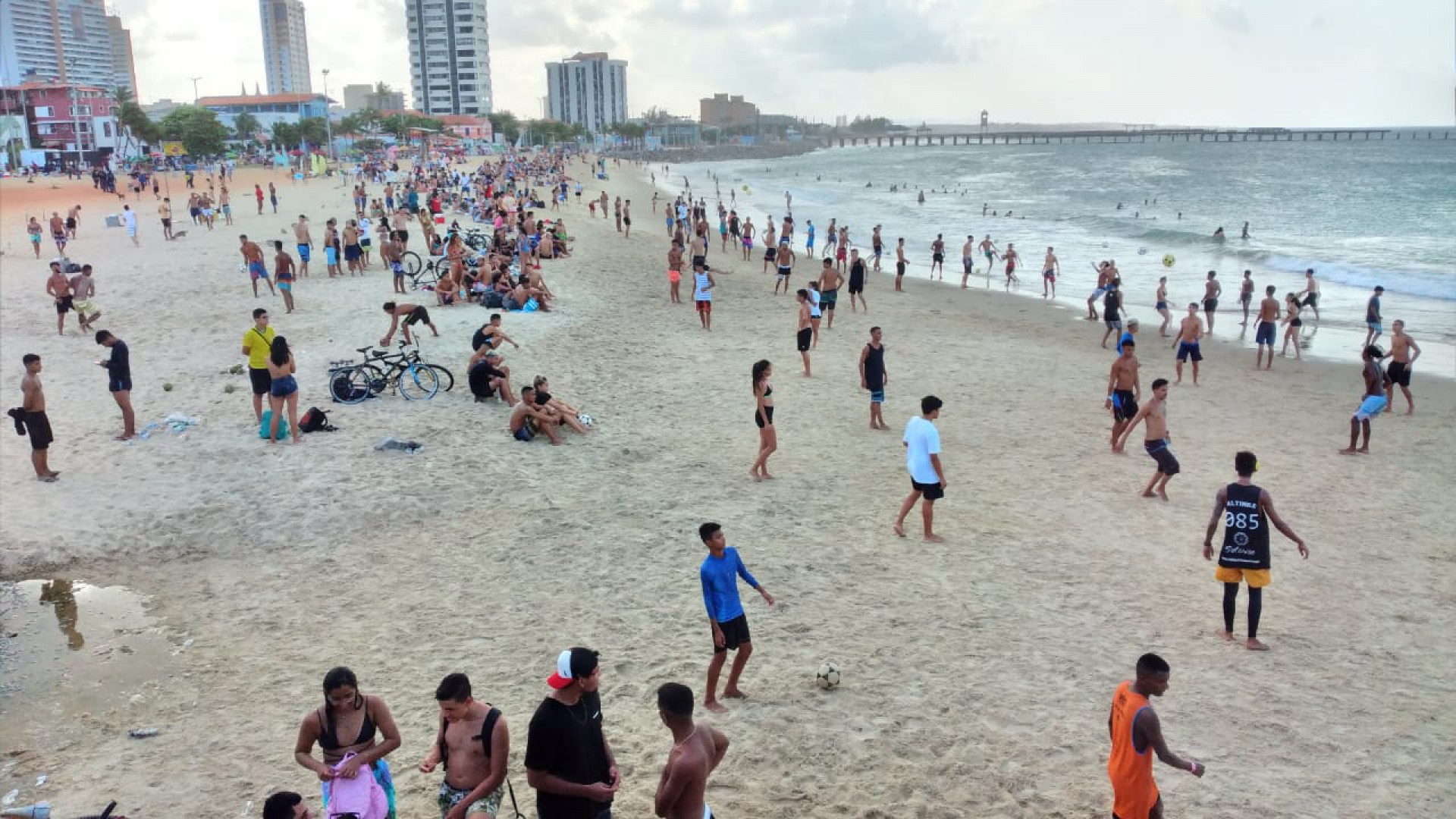 A Praia de Iracema, também conhecida como Praia dos Crush, registrou aglomerações na tarde deste sábado, 9. Por volta das 16 horas, O POVO esteve no Espigão da rua João Cordeiro e pôde observar o movimento no trecho que se estende até a construção do Acquario Ceará. As pessoas no local, em sua maioria adolescentes e jovens adultos, não respeitavam o uso obrigatório de máscaras e o distanciamento recomendado de 1,5 metro a 2 metros. Medidas são essenciais para o enfrentamento à pandemia da Covid-19.