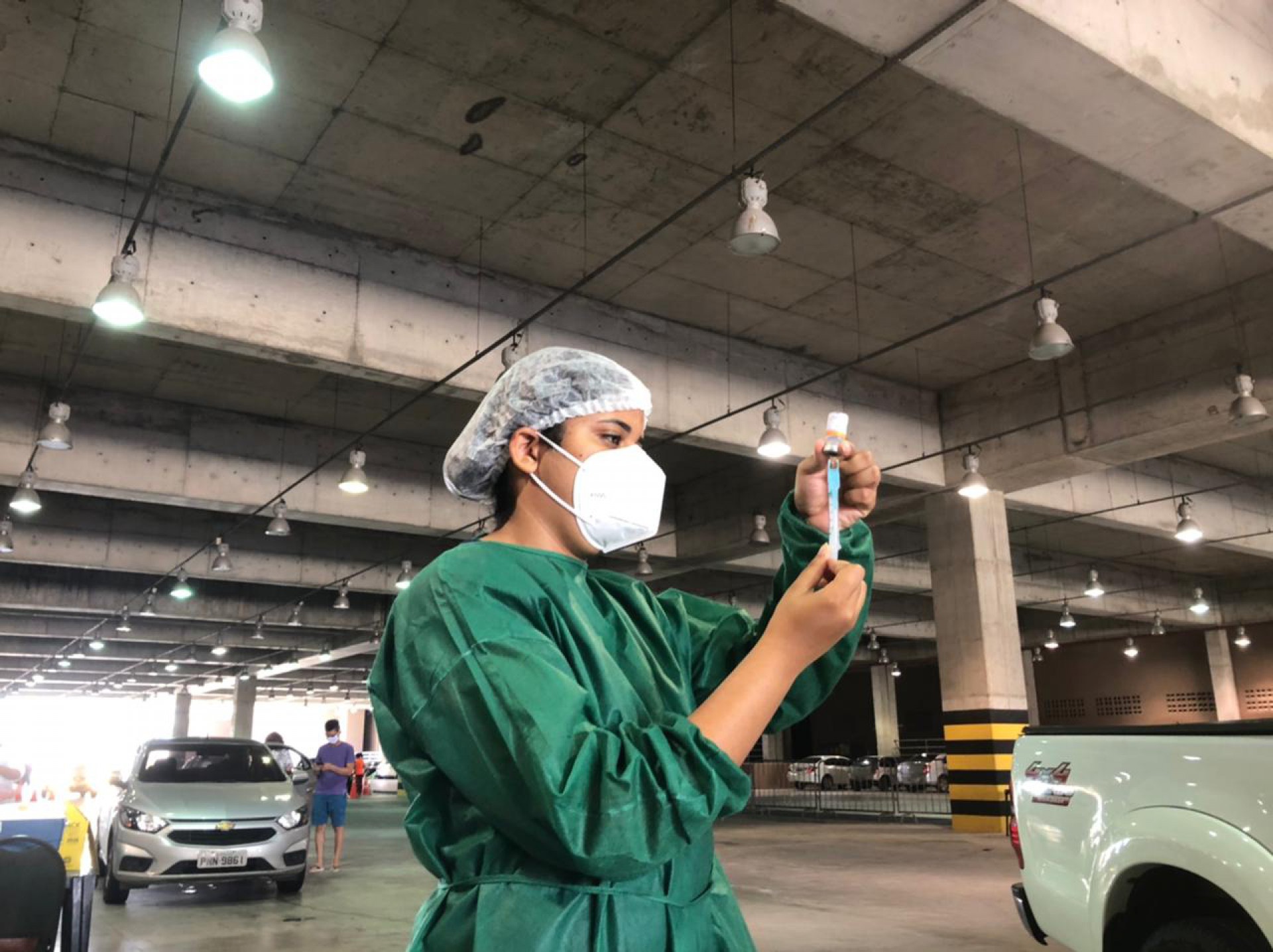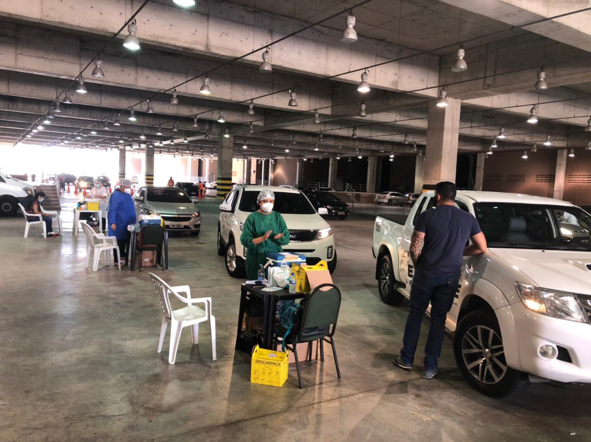 O início da imunização se deu às 9 horas por meio de drive thru. Uma fila andava rápida porque, a partir dela, outras três filas eram organizadas. Imunização segue até as 17 horas