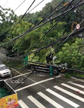 Em razão da colisão, os galhos das árvores caíram sobre fios da rede elétrica de média tensão e a via ficou parcialmente interditada.