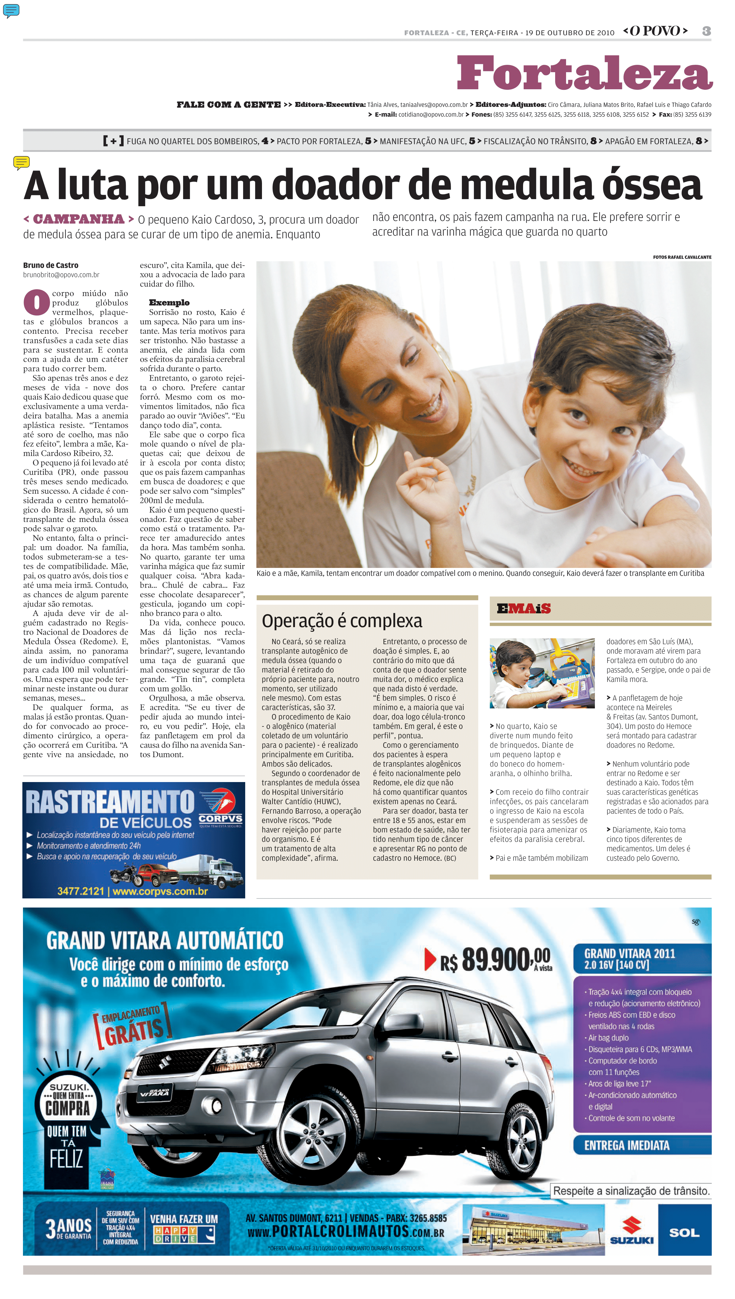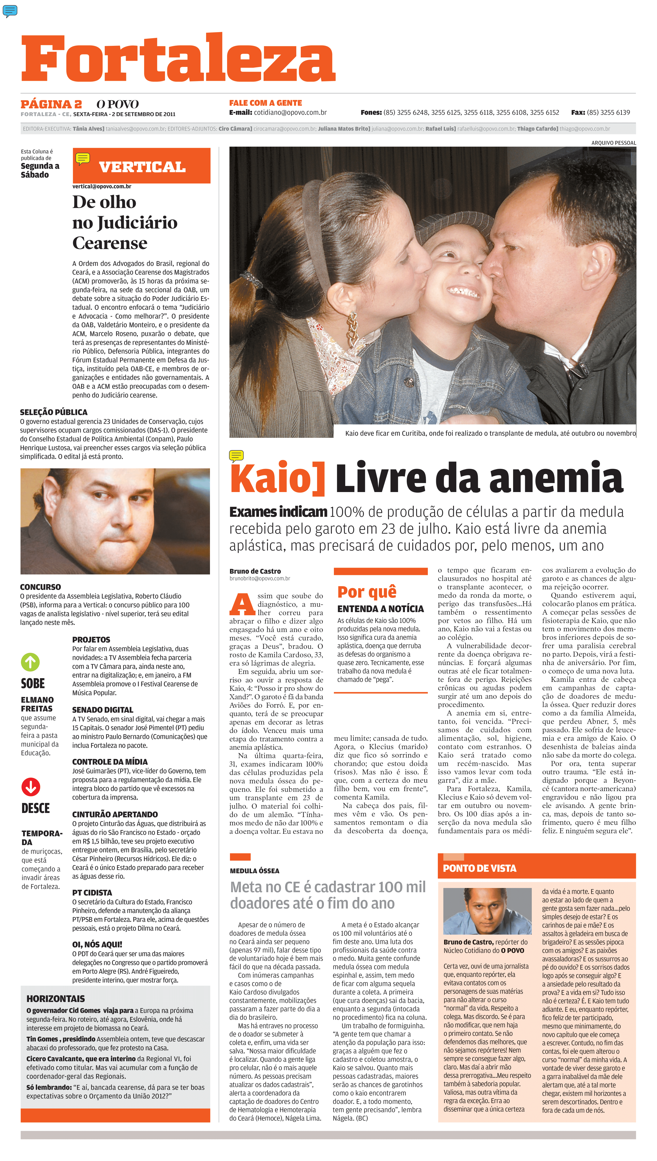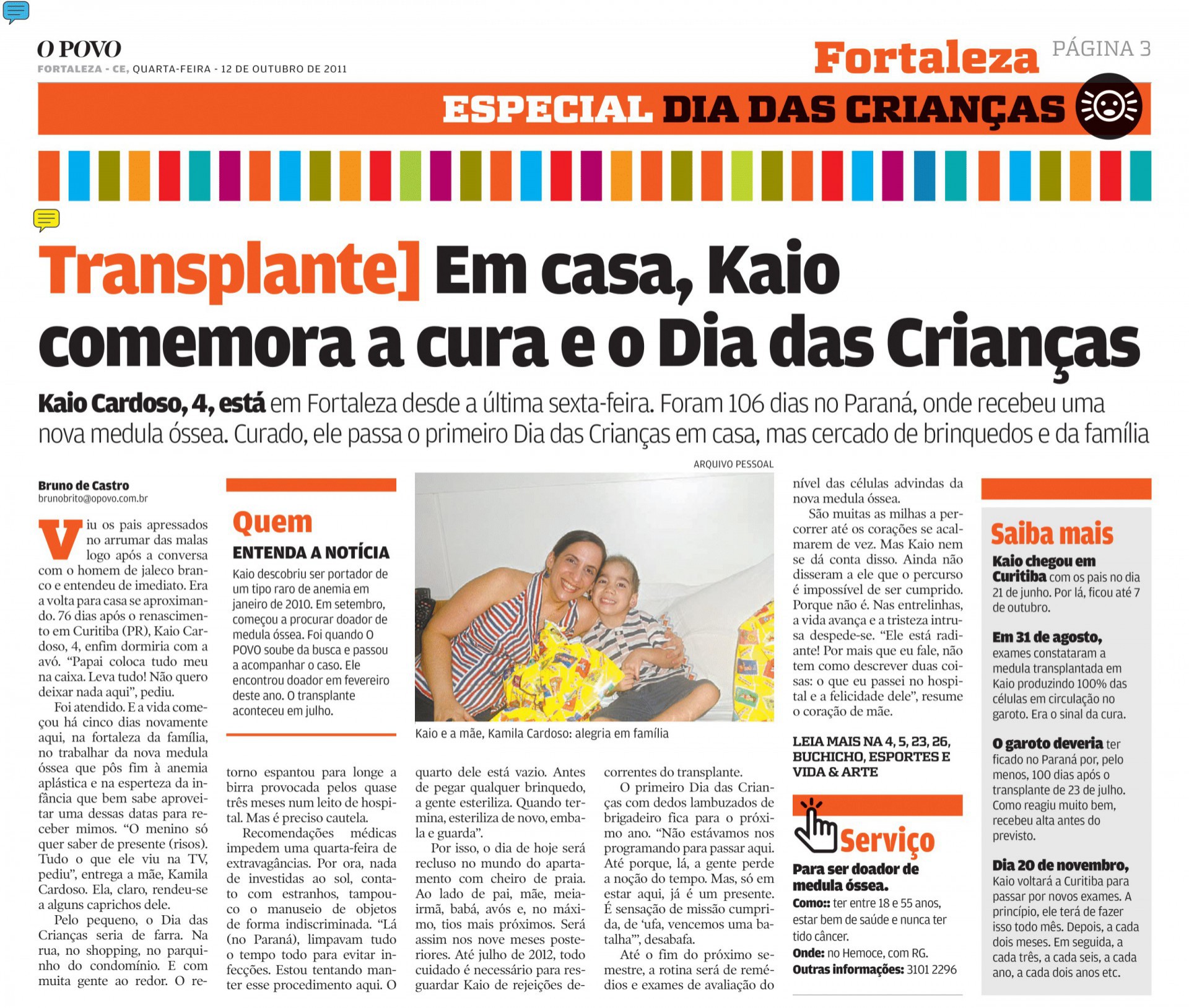 19 de outubro de 2010 | O POVO conhece Kaio e sua mãe para divulgar a campanha em busca de doadores de medula. Pelos meses seguintes, a luta do garoto é contada nas páginas do jornal, especialmente pelo jornalista Bruno de Castro, que se tornou um amigo.
