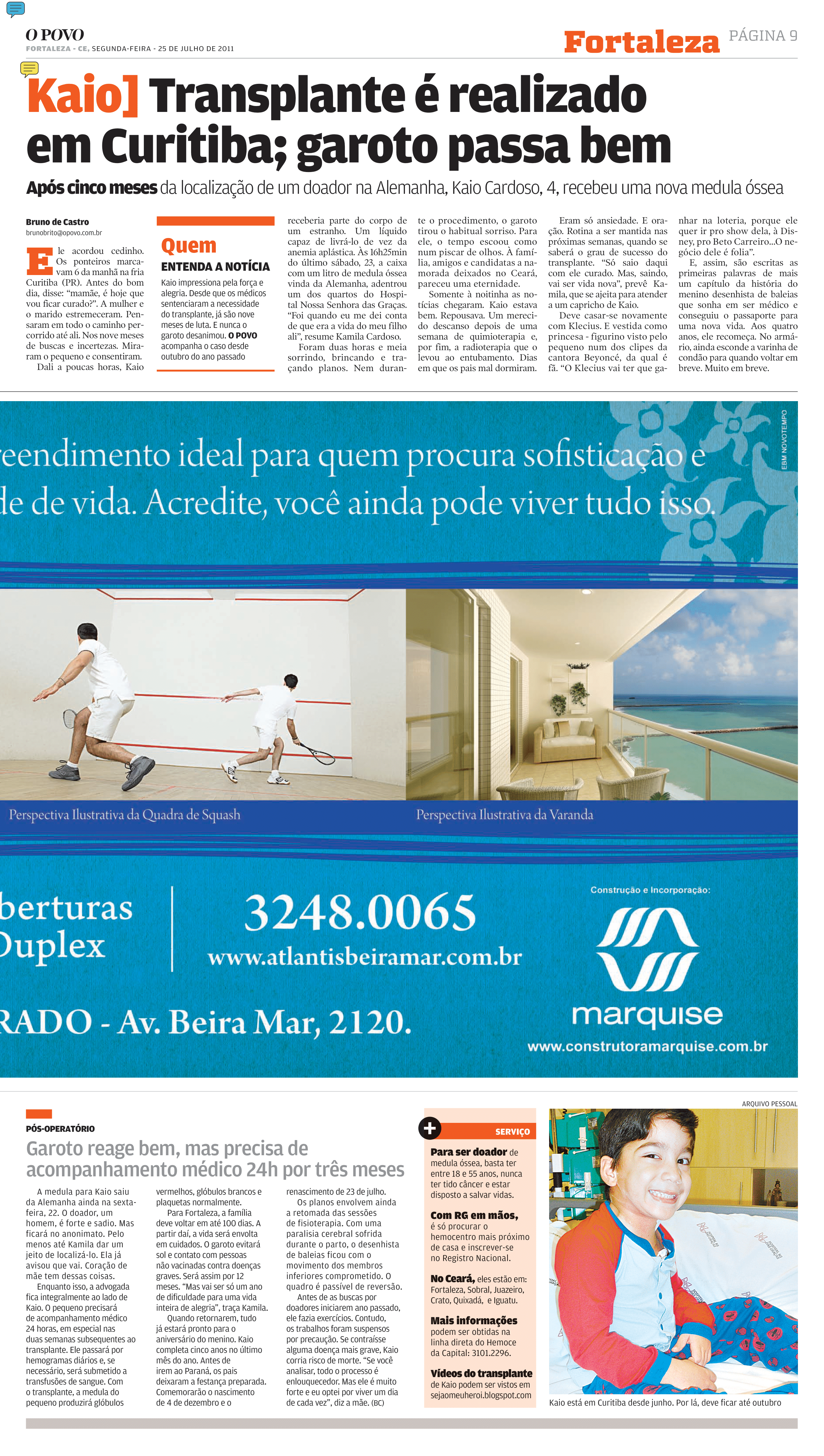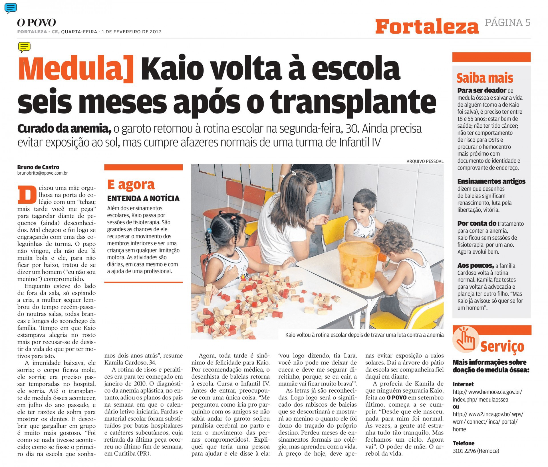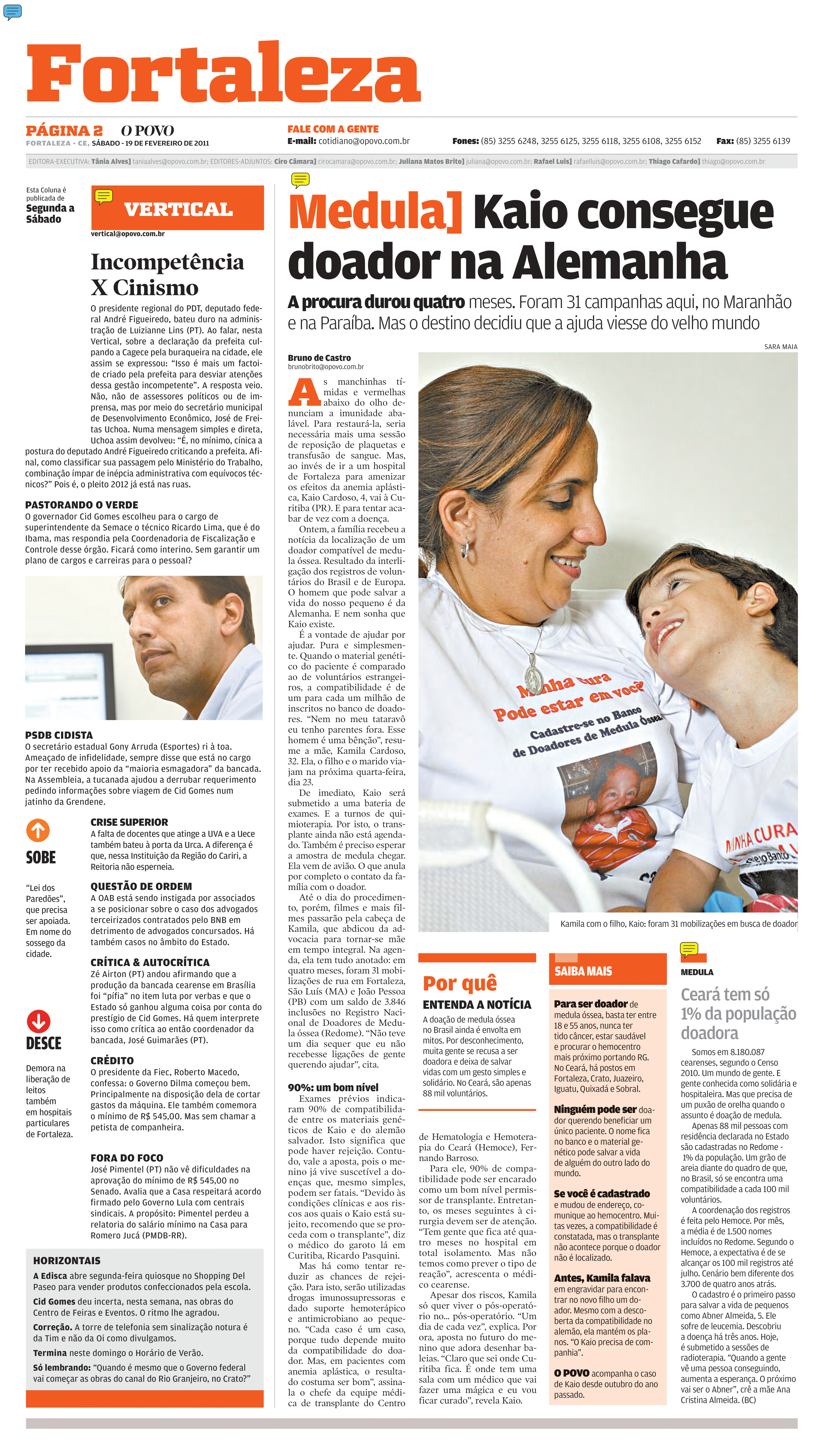 19 de outubro de 2010 | O POVO conhece Kaio e sua mãe para divulgar a campanha em busca de doadores de medula. Pelos meses seguintes, a luta do garoto é contada nas páginas do jornal, especialmente pelo jornalista Bruno de Castro, que se tornou um amigo.