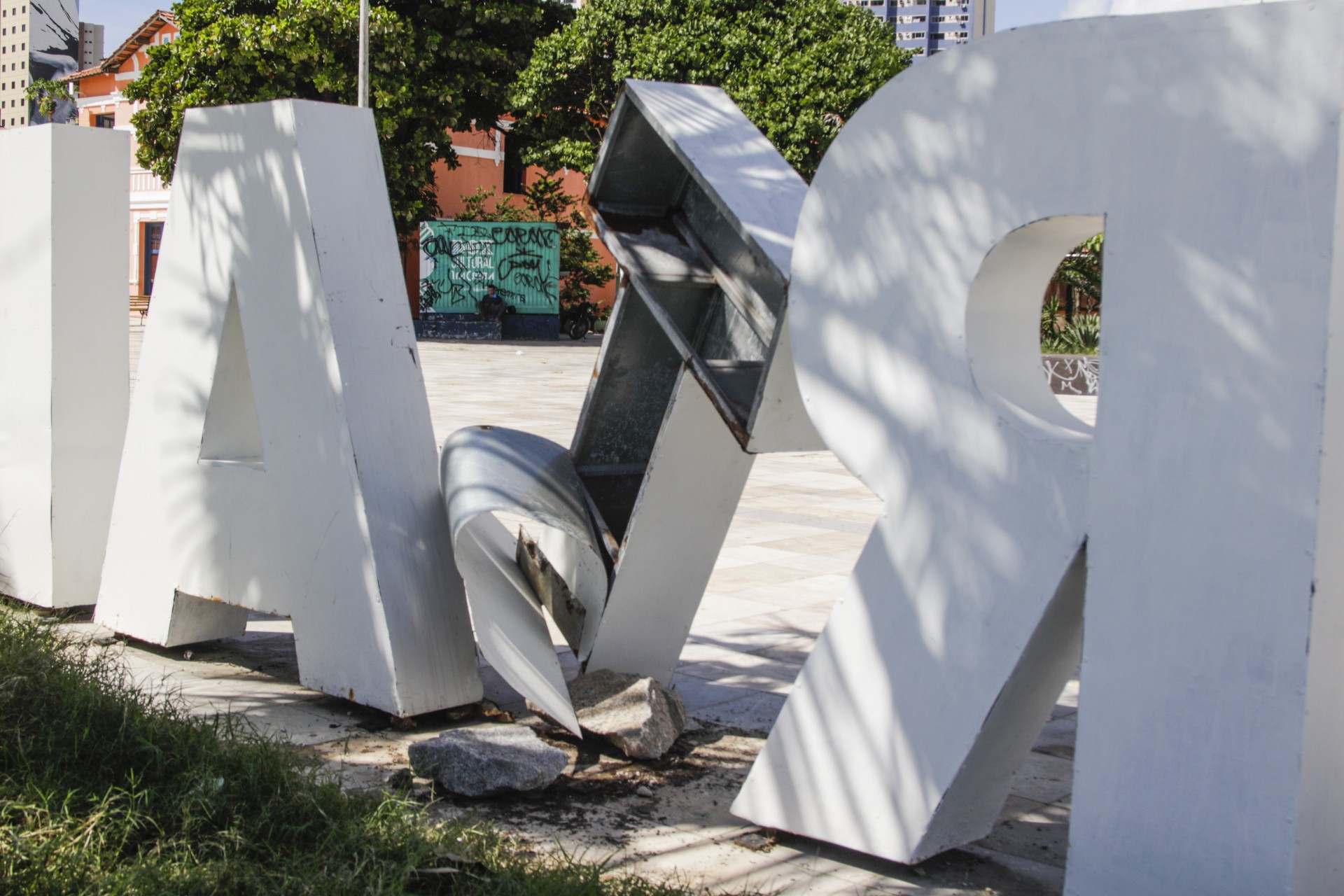 O letreiro “Fortaleza”, localizado na Praia de Iracema, foi alvo de vandalismo contra o patrimônio público. A letra “t” foi movida de posição e inclinada para a esquerda. A parte traseira da estrutura de ferro foi descolada, enquanto a base de sustentação foi arrancada do chão.