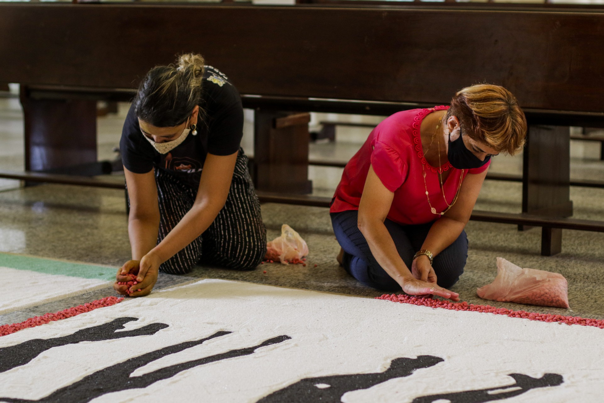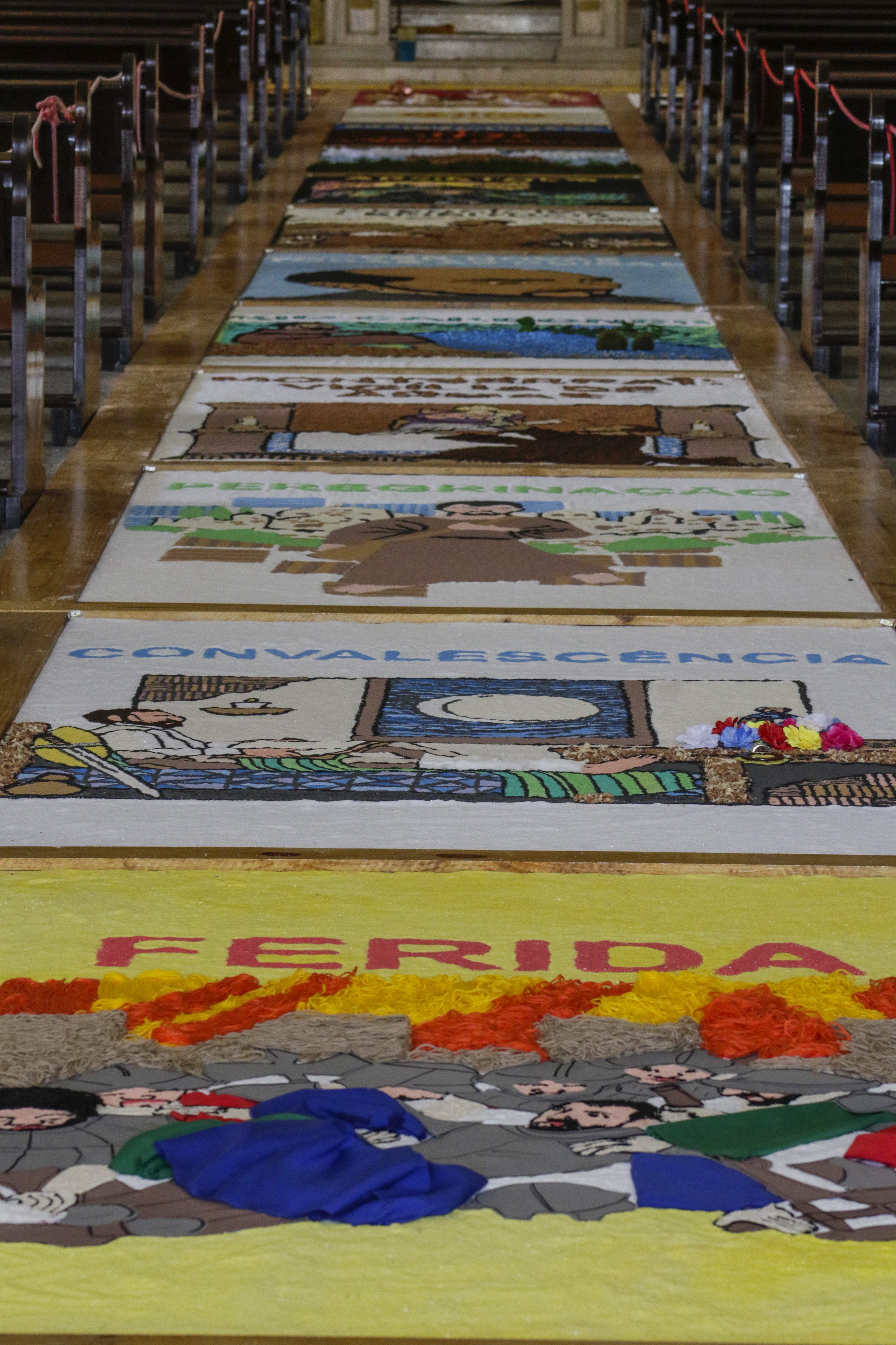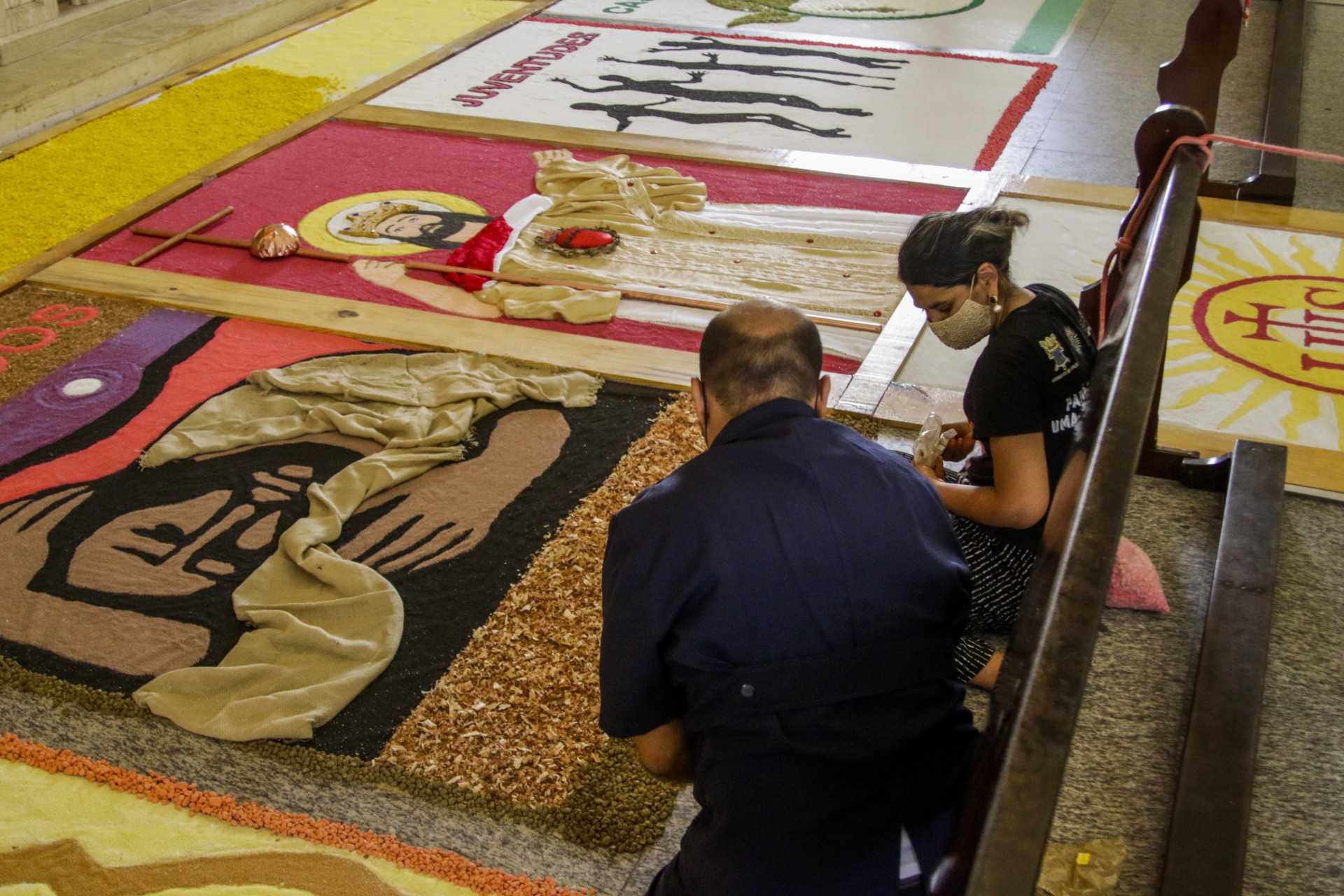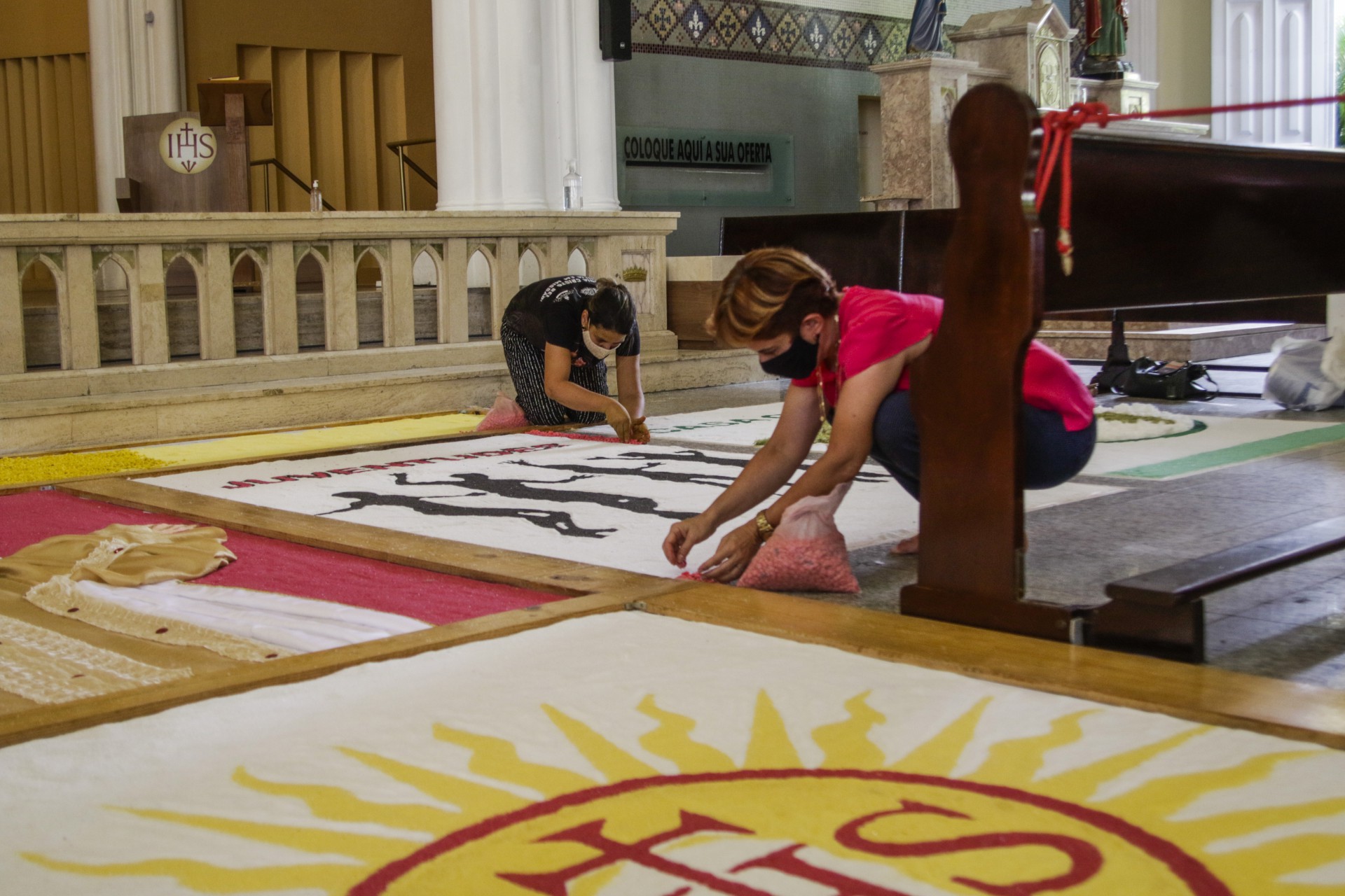Nesta quarta-feira, 2, véspera da celebração, os fiéis de grupos de diversas instâncias paroquiais seguem trabalhando para finalizar o tapete sobre a passarela da nave central da Igreja. A confecção foi realizada em um sistema de rodízio para distribuir o trabalho por vários dias, desde o final do mês de maio, evitando aglomeração de pessoas. A paróquia informou que intenção era que os voluntários, nos dias de montagem, distribuídos em diferentes horários, ficassem distantes uns dos outros e nunca com tarefas concomitantes em painéis vizinhos.