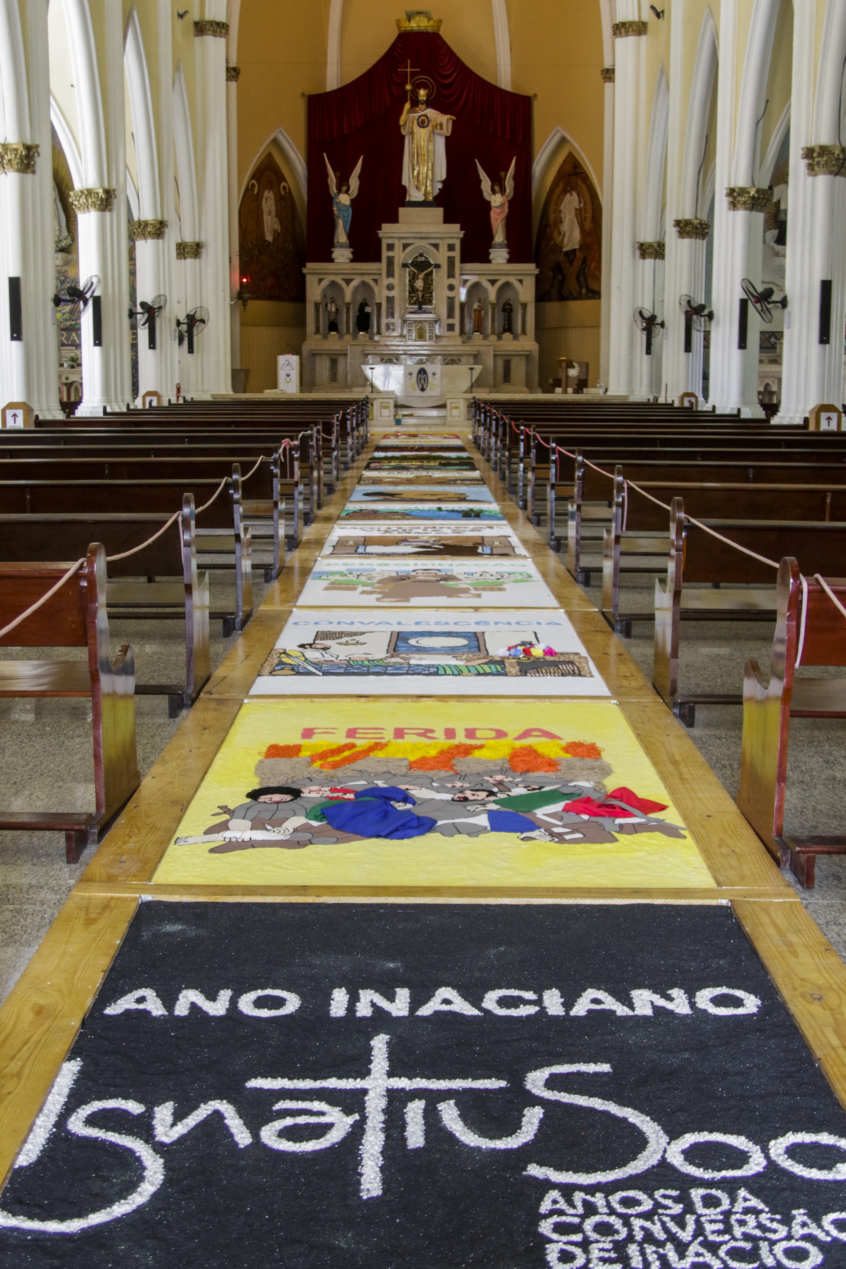 Composto por 17 painéis, o tapete apresenta imagens para referenciar os principais momentos na vida do santo. Segundo informações do Vaticano, Santo Inácio de Loyola nasceu na Espanha e seguiu a carreira militar até sofrer um acidente em uma batalha. Durante a recuperação, ele entrou na vida religiosa e fundou, posteriormente, a Companhia de Jesus aprovada pelo Papa Paulo III em 1538.
