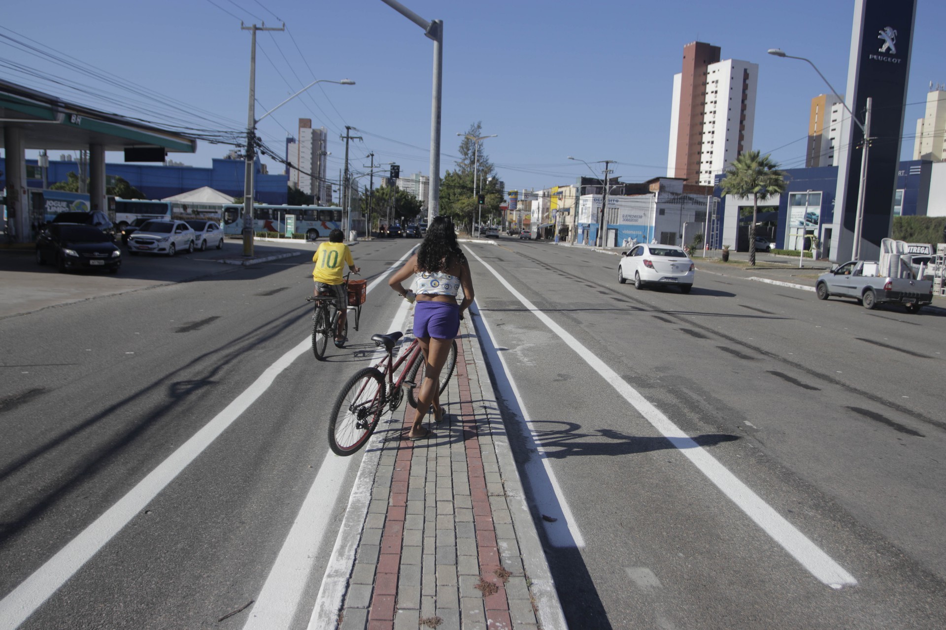 Durante a manhã em que a equipe do O POVO esteve na av. Engenheiro Santana Júnior, ciclistas e pedestres, em diversas ocasiões, não faziam o uso da ciclofaixa e da faixa de pedestres para transitarem na via.